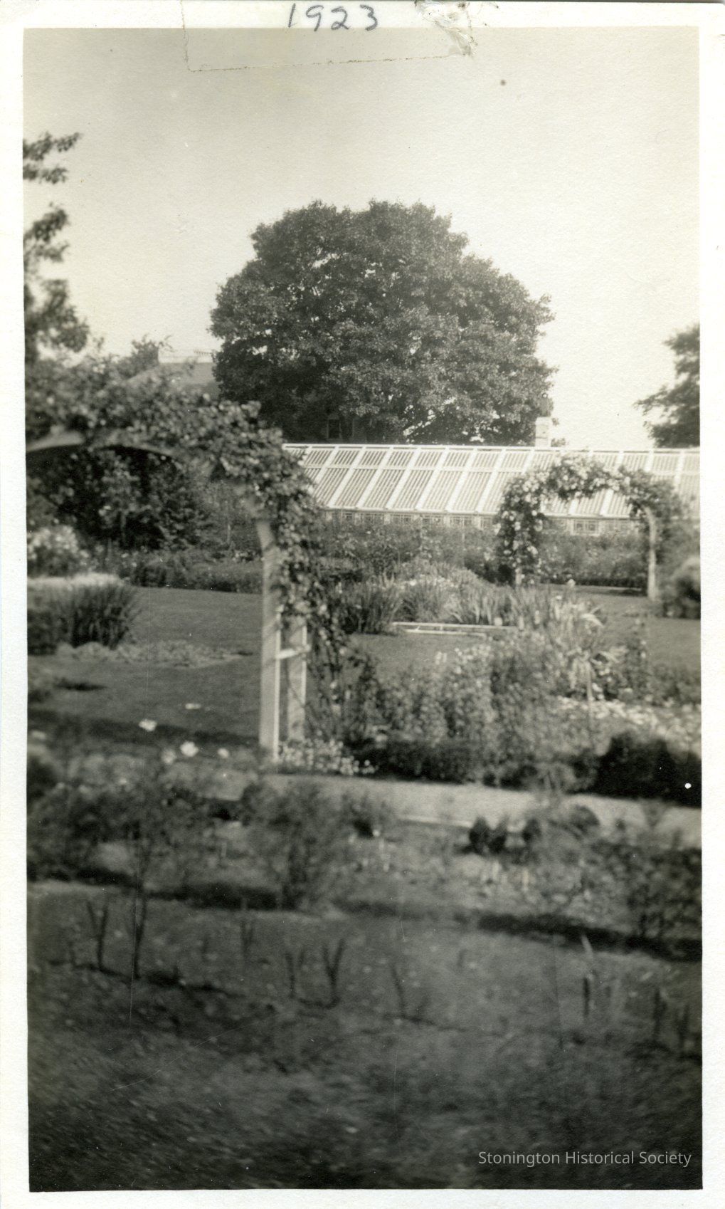 Photograph of the formal gardens and greenhouse at Stone Acres, 1923.