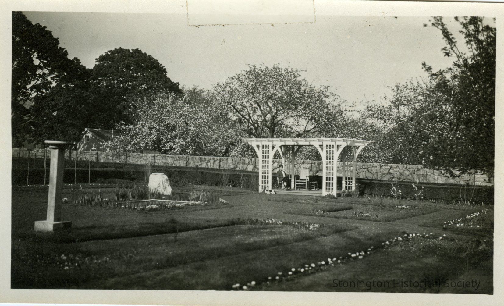 Photograph of the formal gardens at Stone Acres, with a woman (Lila Adams Edwards?) seated outside, "June 1917" written on the back.