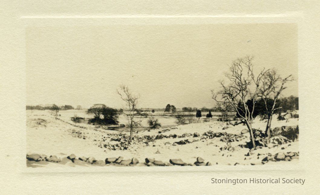 Photograph, winter scene of landscape/farm land at Stone Acres, printed on card, undated.
