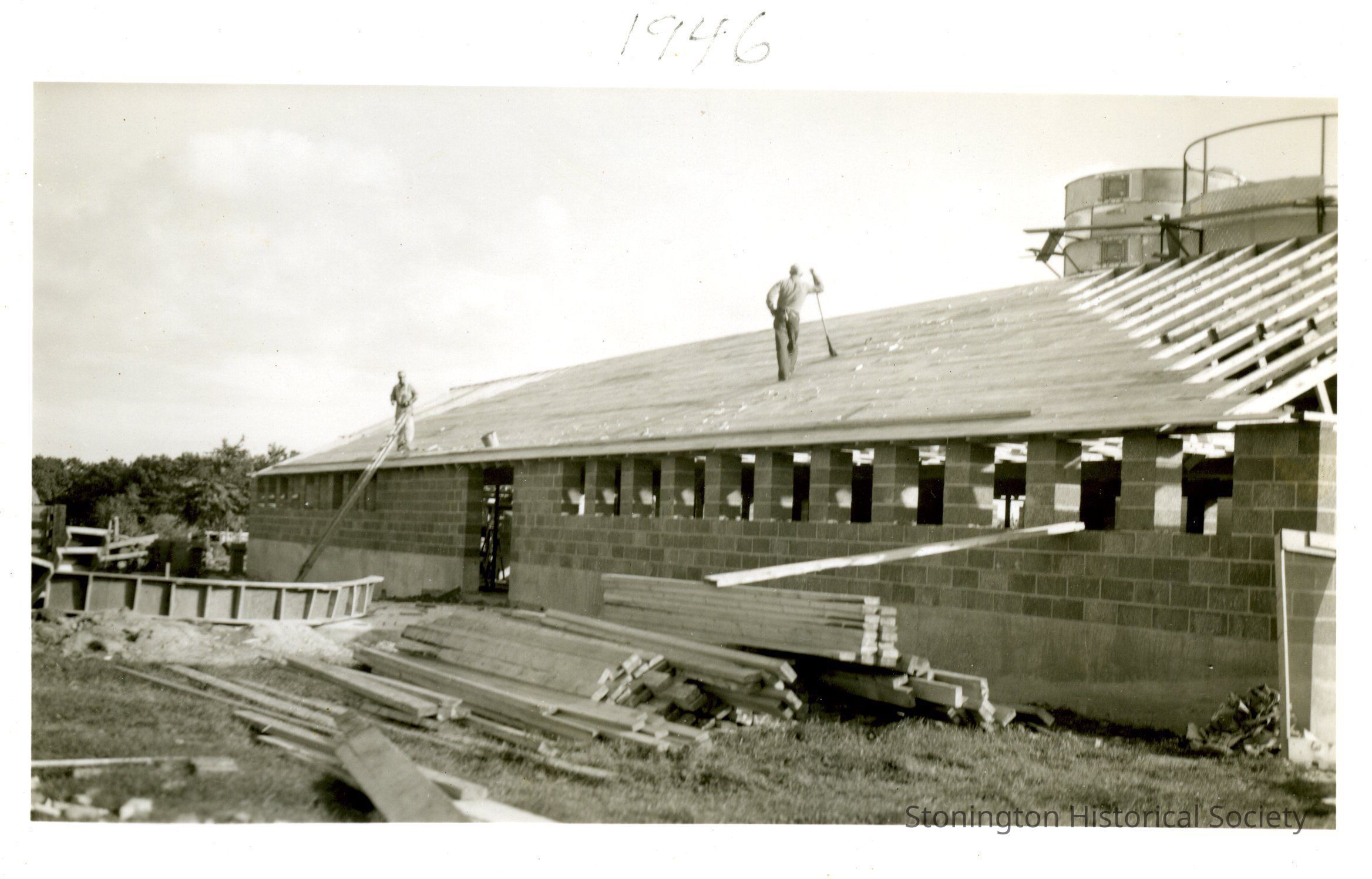 Photograph, construction of the cow barn and silos at Stone Acres, "October 1946" written on the back (2 copies).