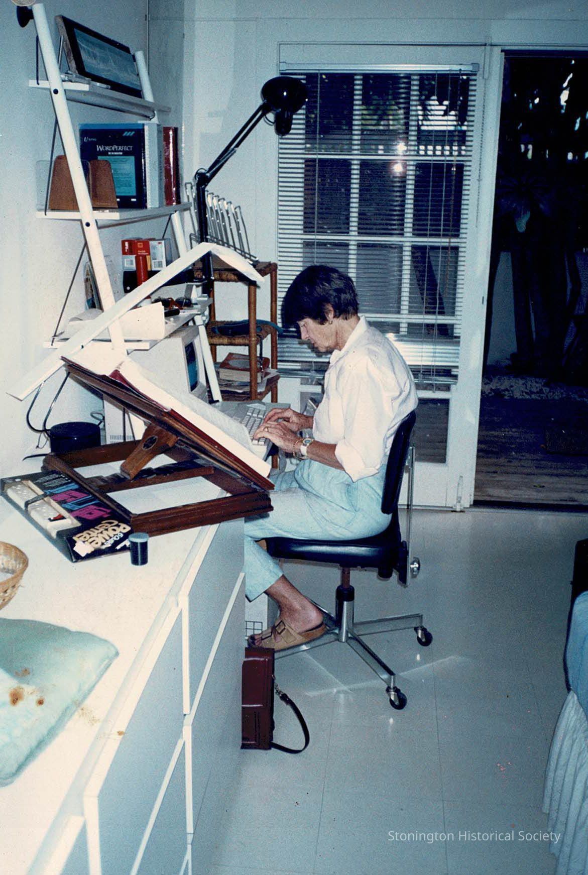Color photograph of Rollie working on her book "A Life in Photography".