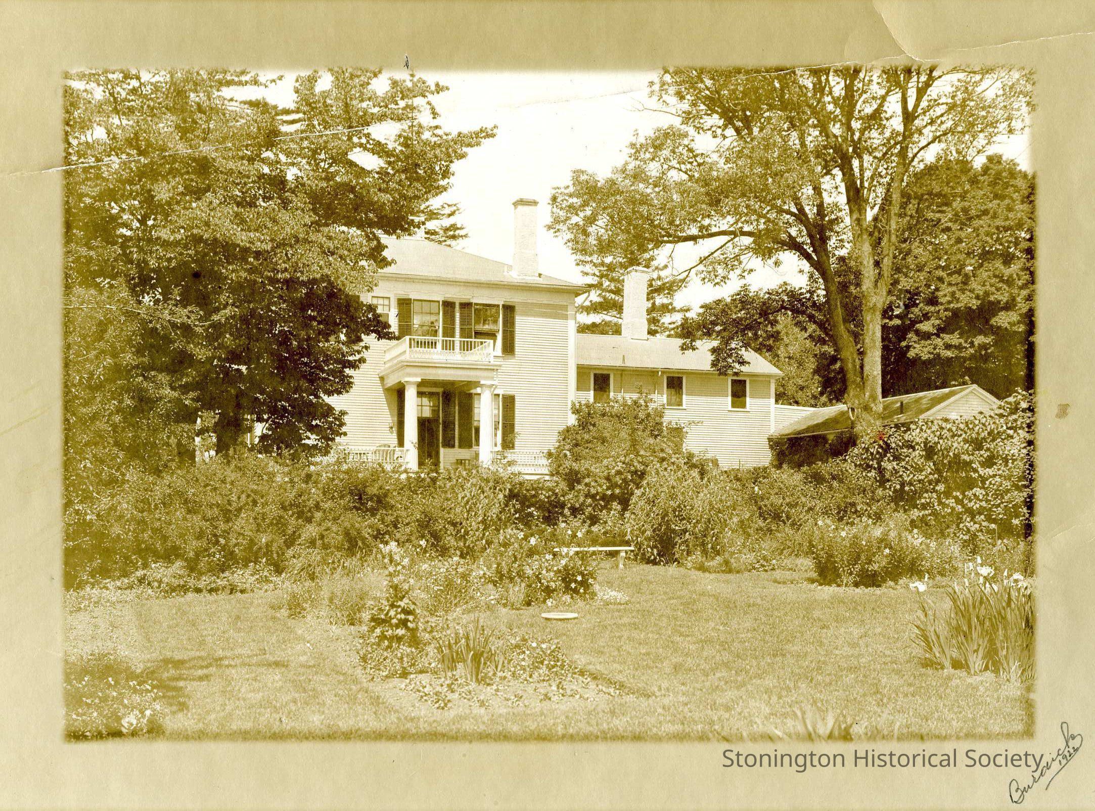 A photograph showing the side entrance of Stone Acres Farm, and a bit of the formal gardens in the foreground. This photograph has two dates. It appears to be a copy of a photograph taken by Burdick in 1922. The reverse of this photograph has the date 1934.Collection