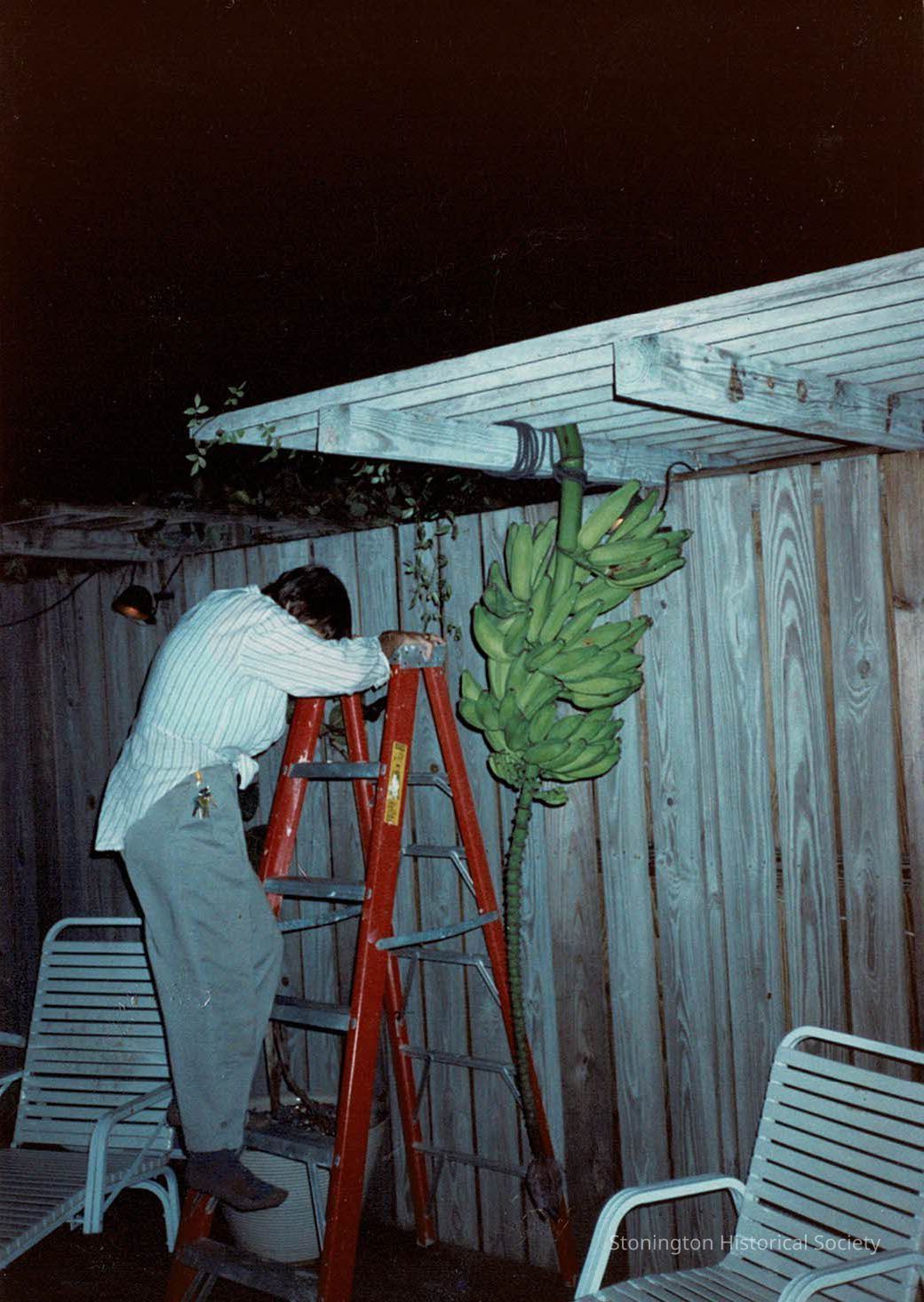 Color photograph of Rollie on a ladder tending to the bananas in her yard in Florida.