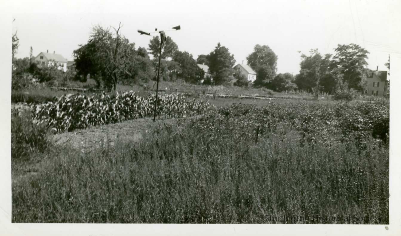 A black and white print of corn growing on Palmer/Loper land. Most likely taken in the marsh field, as the stone wall along Palmer Street is visible in the background.Collection
