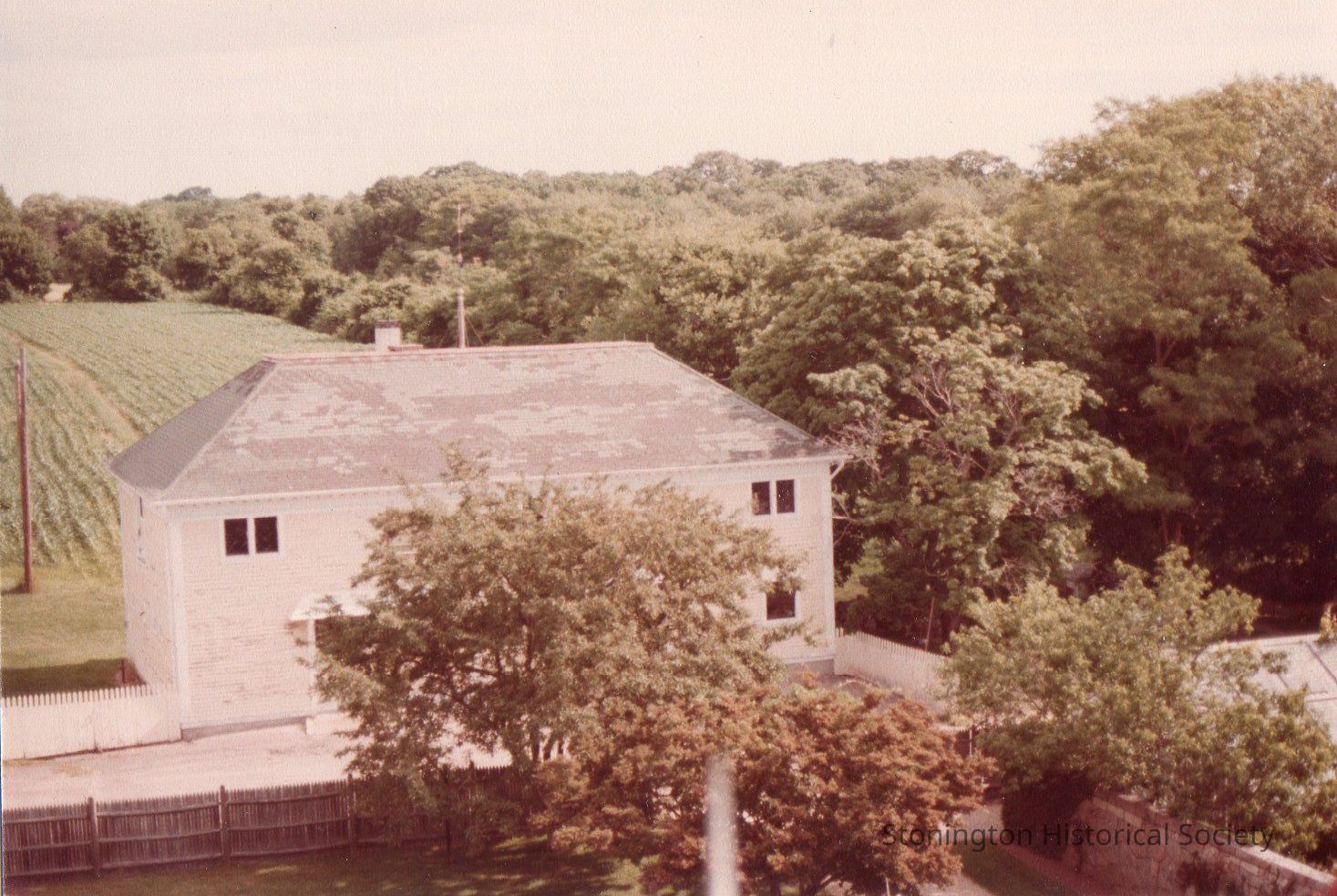 color snapshot of the Stone Acres grapery (bottom right corner), farmland and outbuilding (looking down from the back side of the house?), September 1980