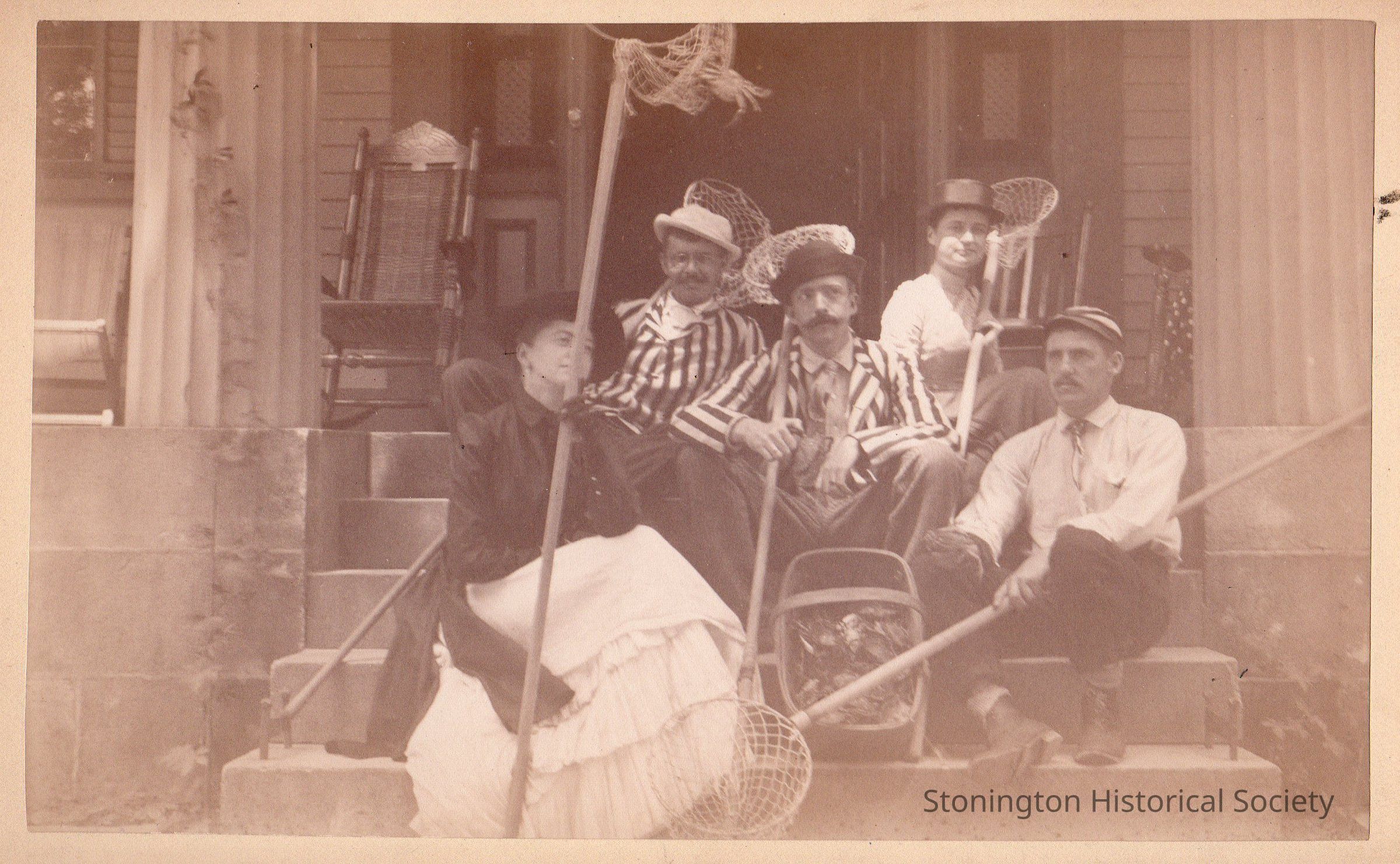 A photograph mounted on board. Three men and two women are pictured seated on the front porch on the main house at Stone Acres. All five are holidng nets and displaying a basket of crabs. They are most likely relatives of Eugene Phelps Edwards or his wife Eliza Kendall Adams, and had come for a sort of reunion or family gathering.Collection