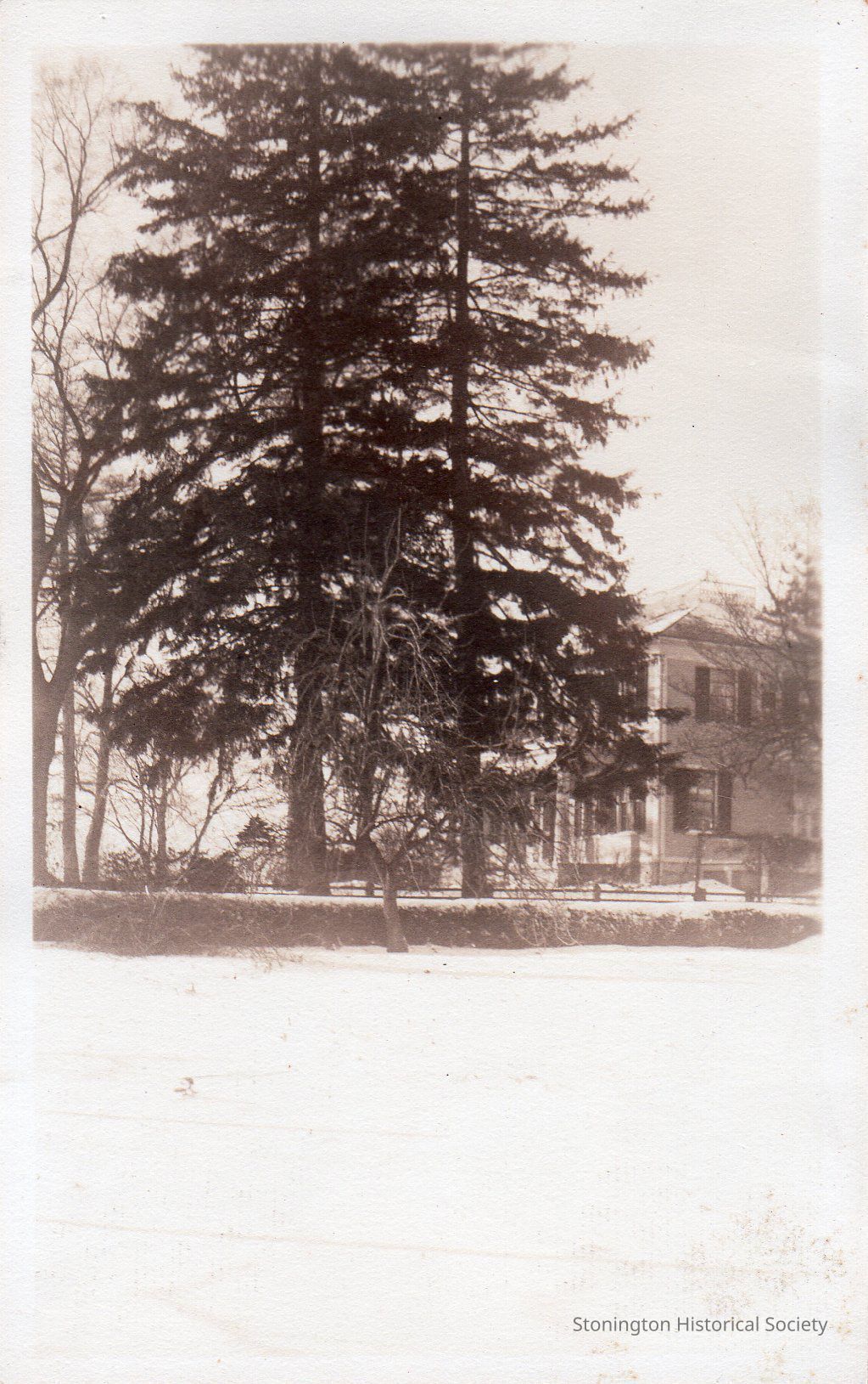 black and white photograph printed on cardstock, Stone Acres main house in winter, c. 1934