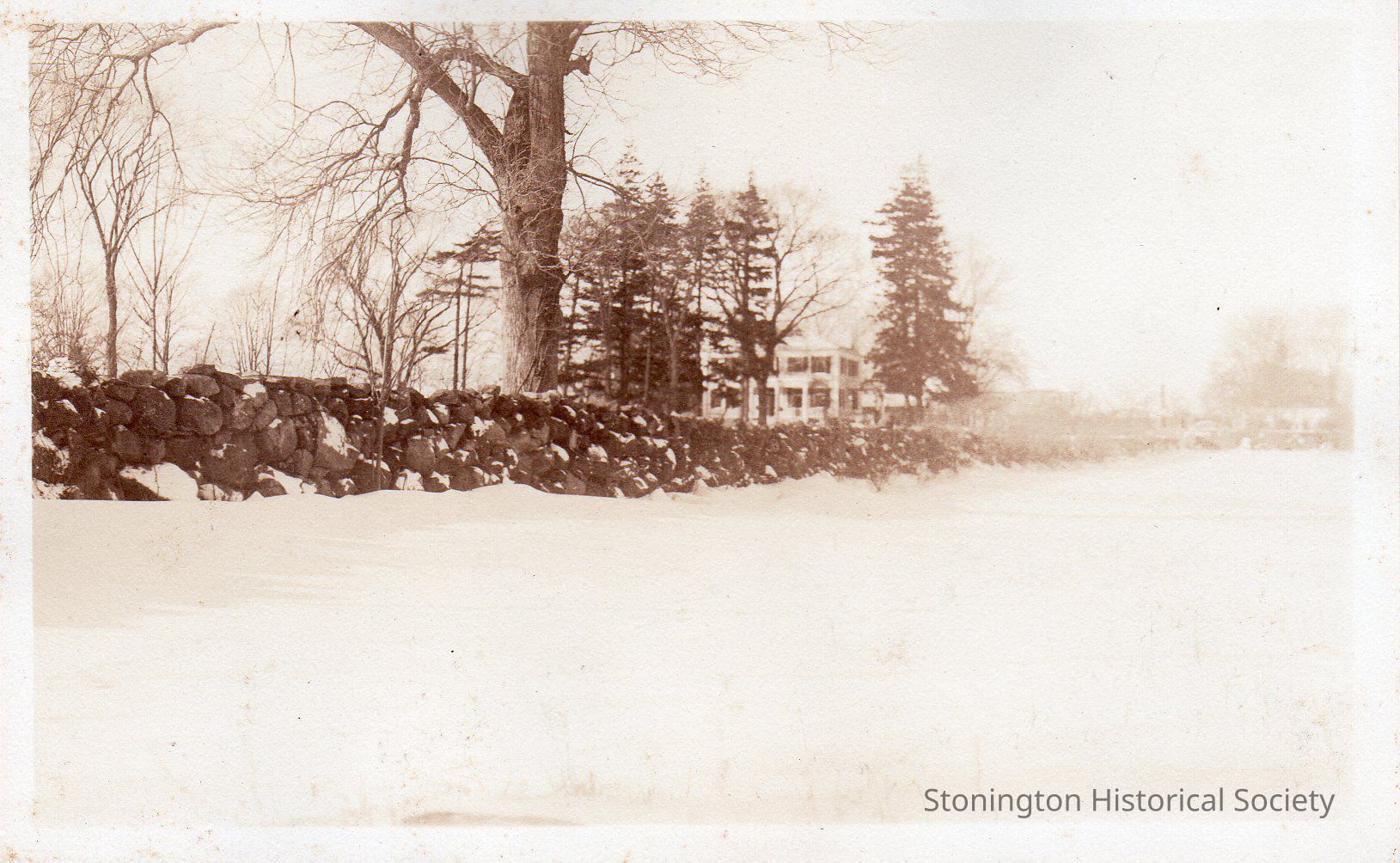 black and white photograph printed on cardstock, Stone Acres main house in winter, c. 1934