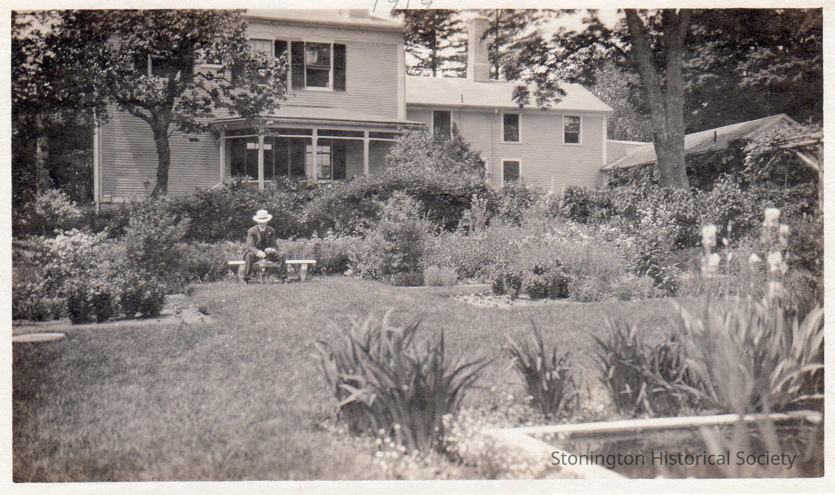 black and white photograph of Eugene Phelps Edwards, sitting in the flower garden in front of the east side of the house before the proch was renovated, 1919