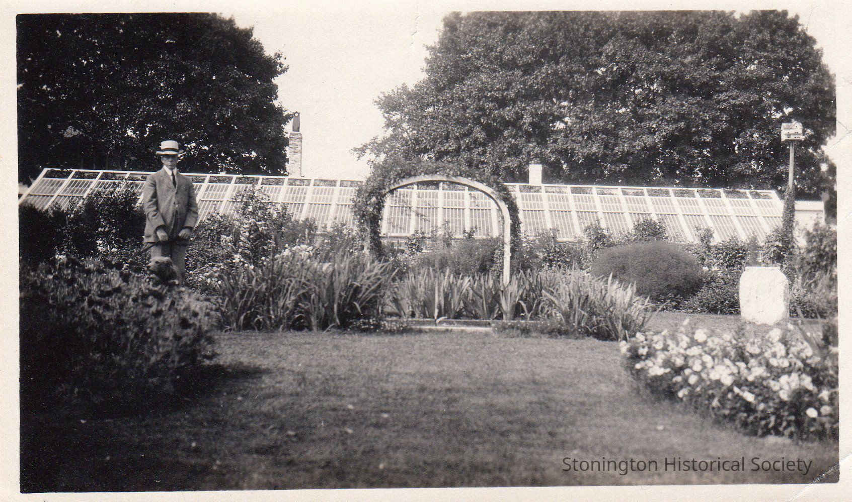black and white photograph of Eugene Phelps Edwards in front of the grapery at Stone Acres, 1923.