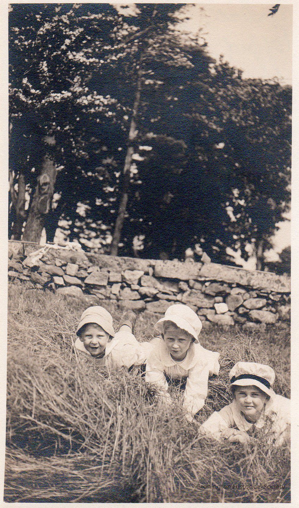3 black and white photographs of Elizabeth, Jane, Fred Jr., playing in the front yard, c. 1917