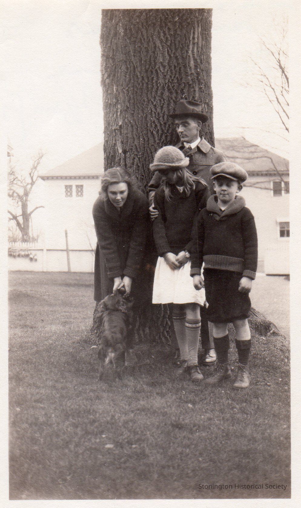 black and white photograph of Elizabeth, Jane, Fred Paffard Jr. with James Adams, c. 1923