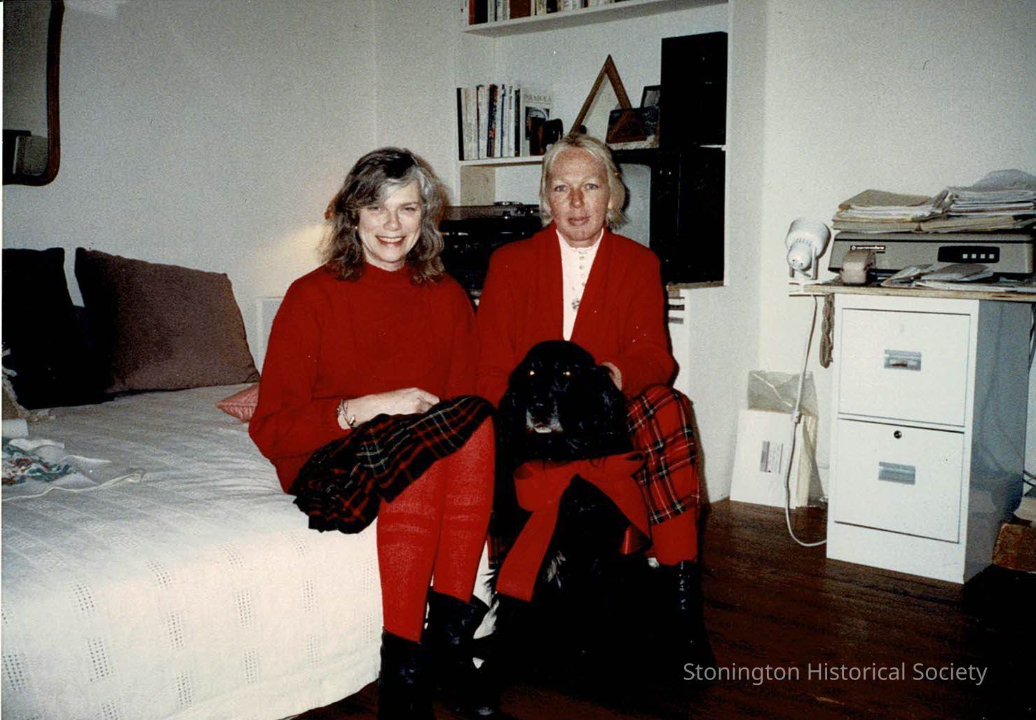 Color photograph of two women seated on a bed. They are both wearing red with a black dog wearing a red bow. Possibly a Christmas photo? The woman on the right is Gay Warren, the donor.Collection