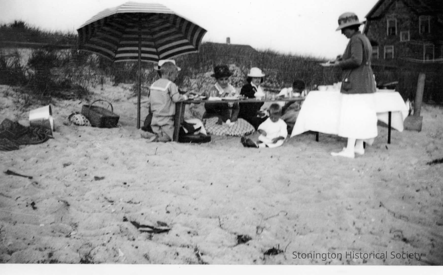 Family picnic at the beach, probably taken around 1908. The photograph is unidentified, but was probably taken at Misquamicut or Wamphassuc Point.