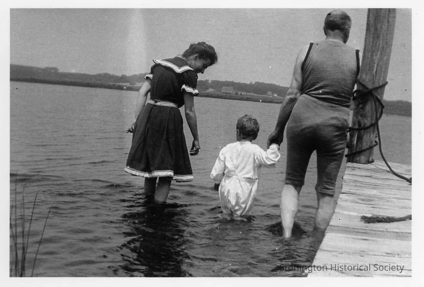 Jessie Anderson and her son, Robert P. Anderson walking away from a dock in the shallow water. There is an older man walking with them who may be Jessie's father.
