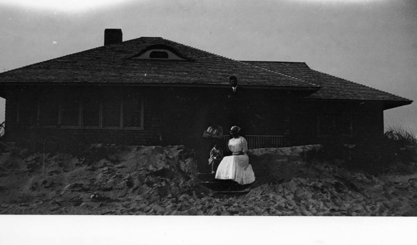 Unidentified family sitting on the steps to their beach home. Probably taken in Misquamicut, RI, and may well be Anderson relatives.
