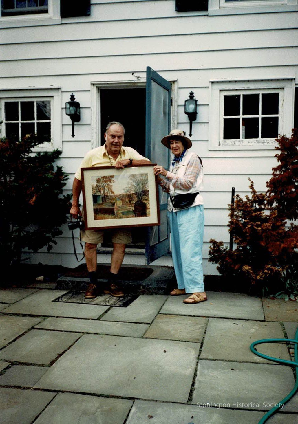 Color photograph of Rollie with an unidentified man. He is holding a painting and a camera. Perhaps he is a photographer friend?
