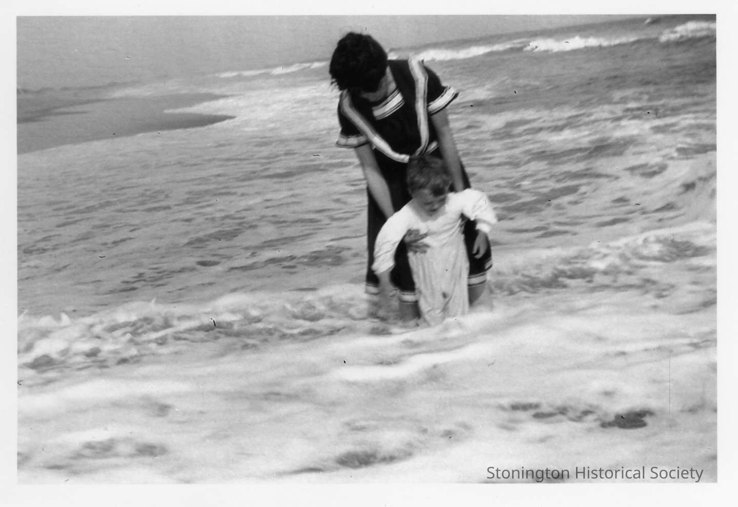 Jessie Ashby Anderson and her son Robert P. Anderson in the waves at the beach. Negative is included behind picture.