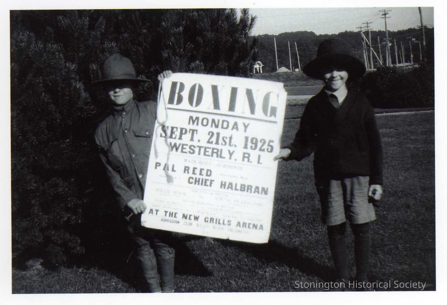 Two little boys holding an advertisement for Boxing in Westerly, R.I. Donor believes the photograph was taken in Noank, CT. The little boy on the left is wearing a World War I military style outfit.
