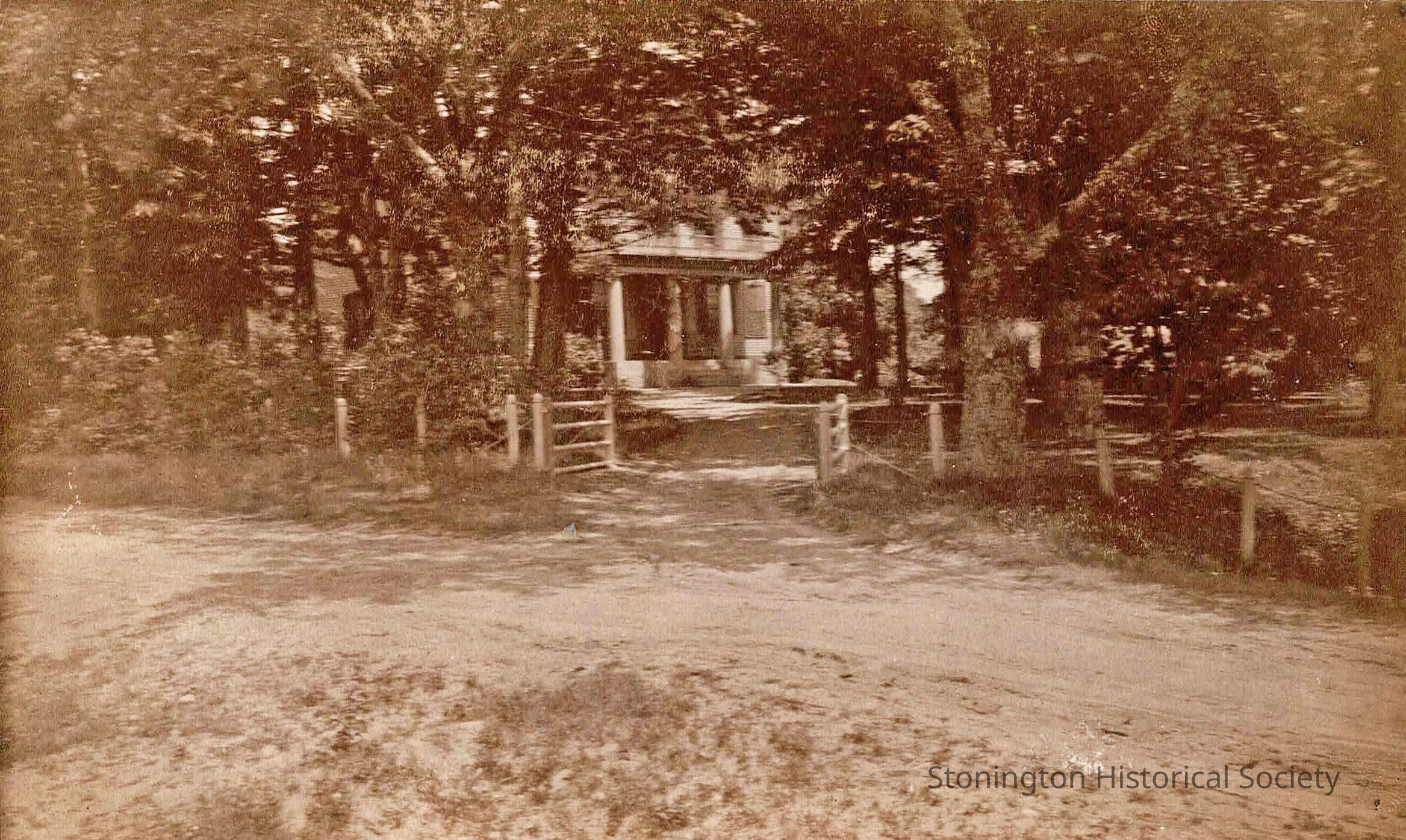 Another exterior view of the main house at Stone Acres, taken from the road. There is no date written on the reverse of this photograph, but due to the shadows and composition of the image, it is believed to have been taken in 1900. North Main Street is a dirt road, an the original wooden fence is visible. The house had many more trees around it, obscuring the view from the road.Collection