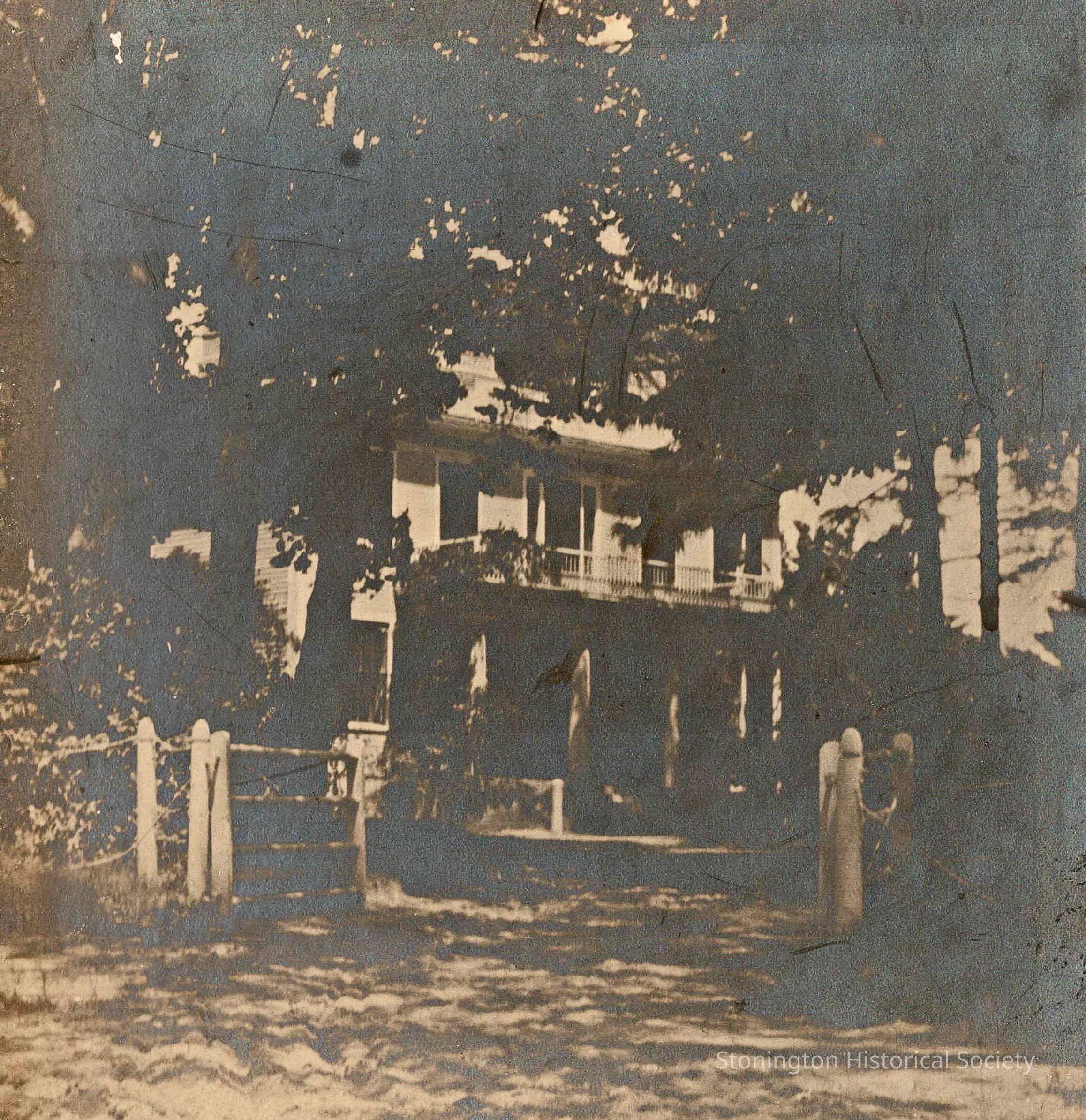 A close up of the entrance from the road to Stone Acres, probably taken around the turn of the 20th century. The wooden front gate is still there, as this photograph was taken before the stone columns at the entrance were built. Note that North Main Street is a dirt road.Collection