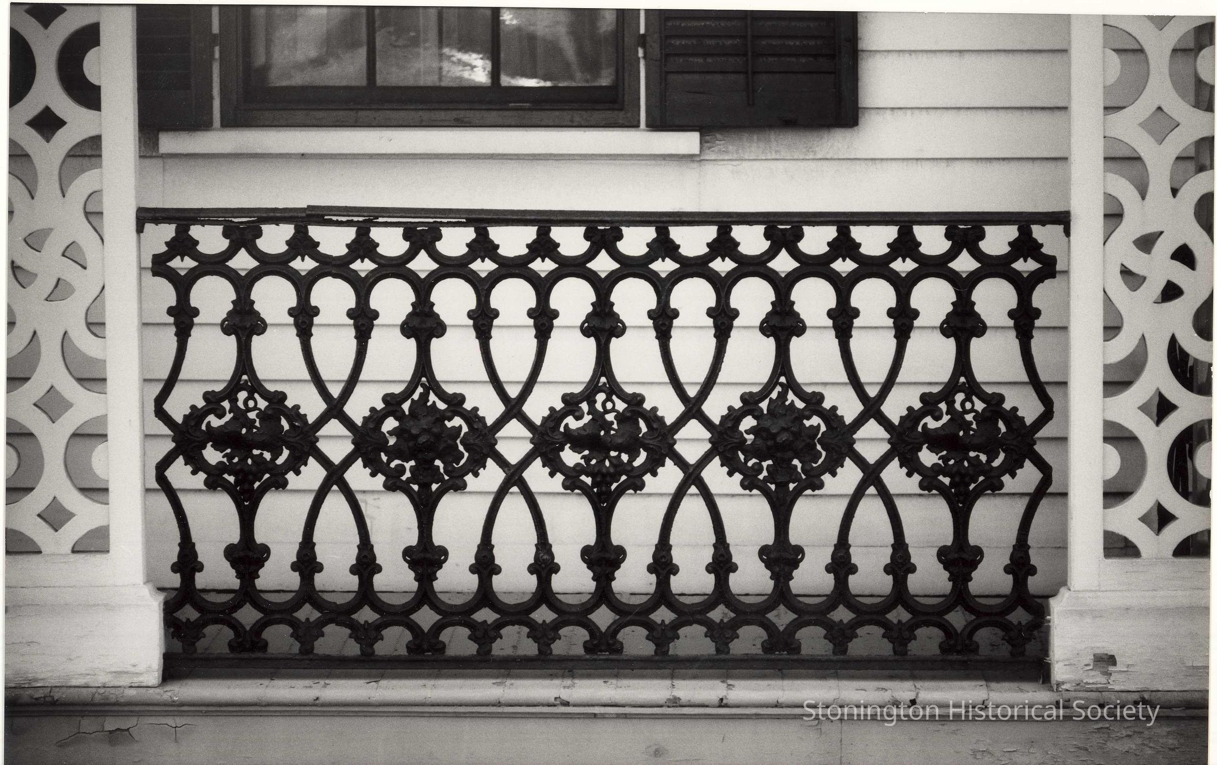 Close up of cast iron fence on front porch at corner of High and Main Streets.