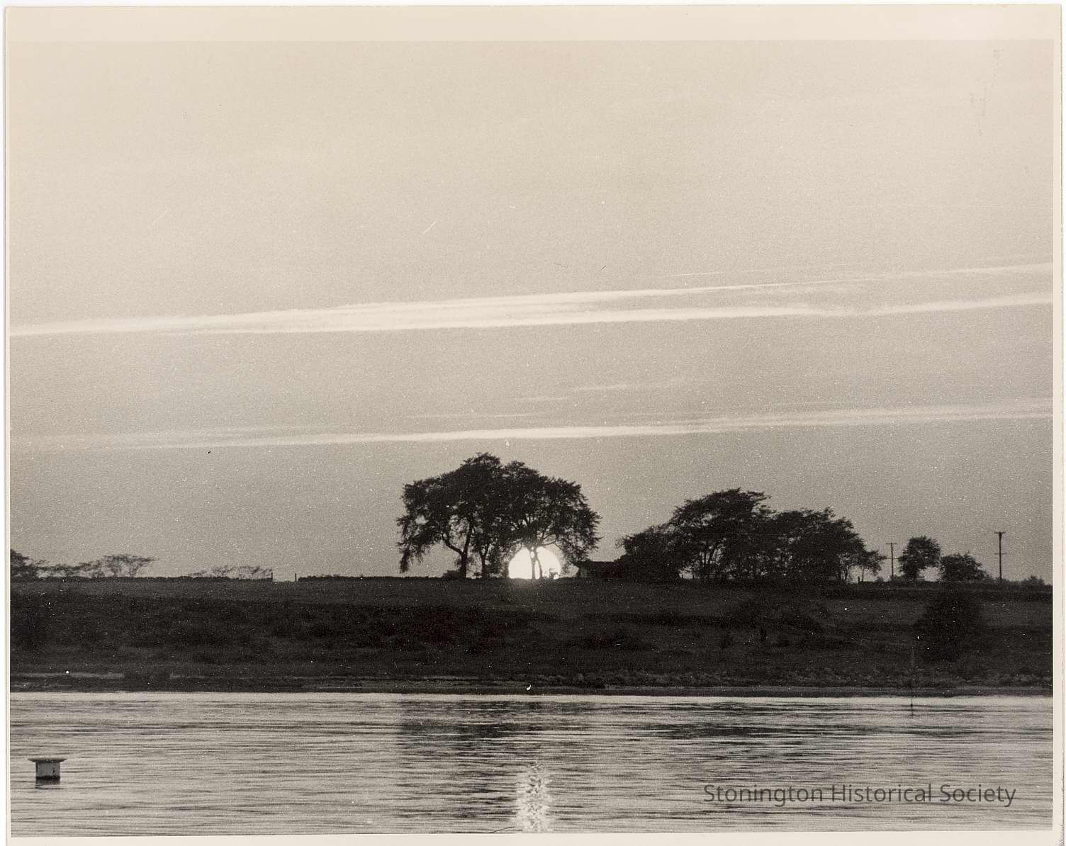 Sunset view from water toward land.