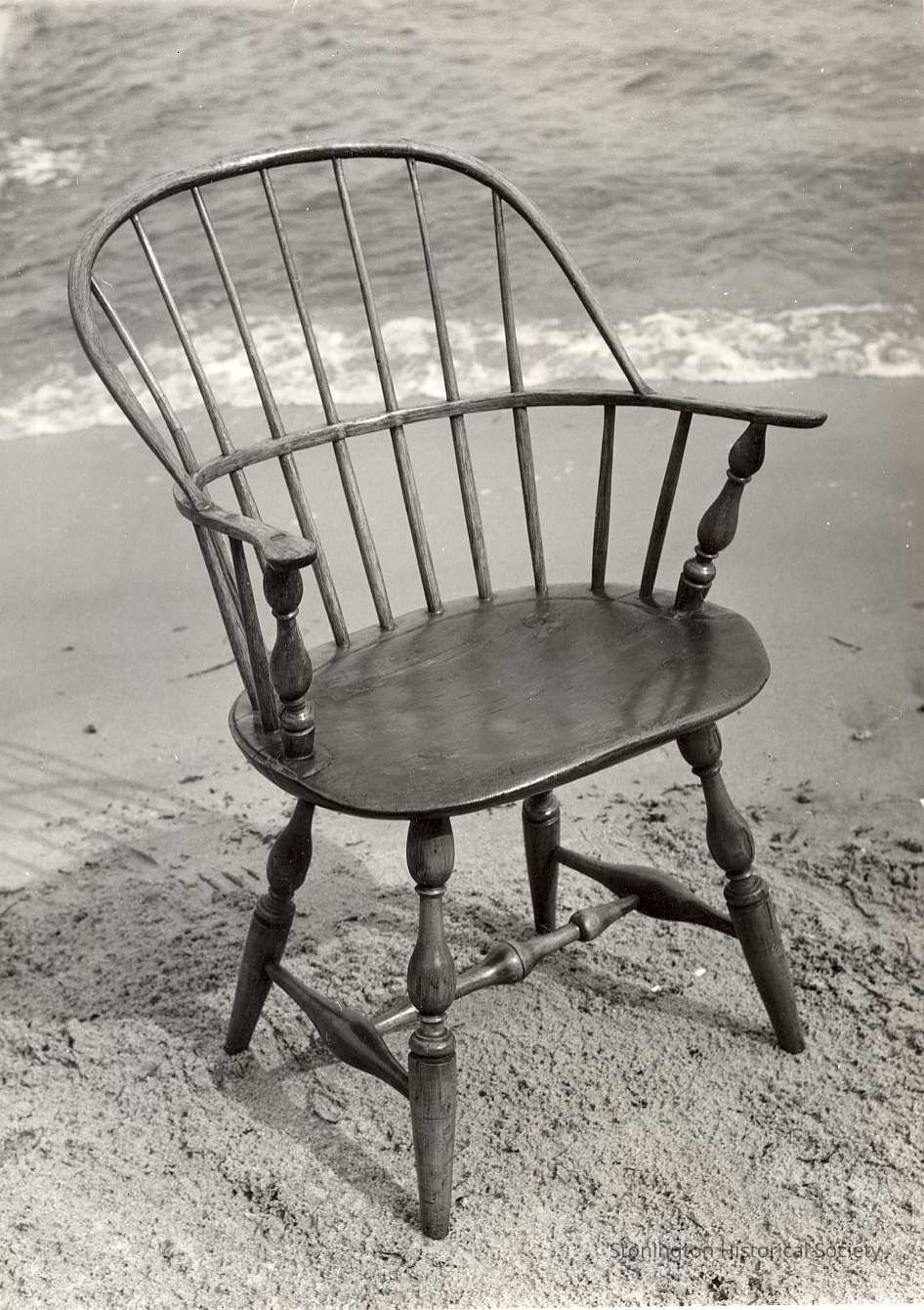 Captain's chair on beach with small surf in background. (In book under Art Galleries)Collection
