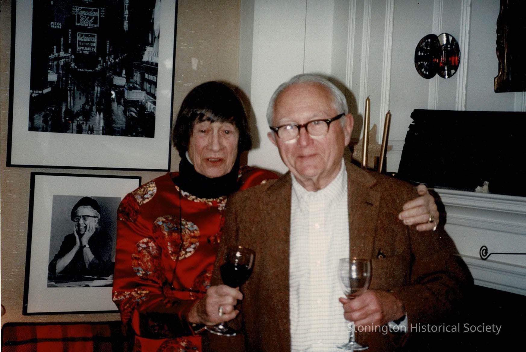 Color photograph of Rollie and Dan Jones (?). They are most likely in Rollie's house in Stonington as a photograph she took is framed on the wall behind her.