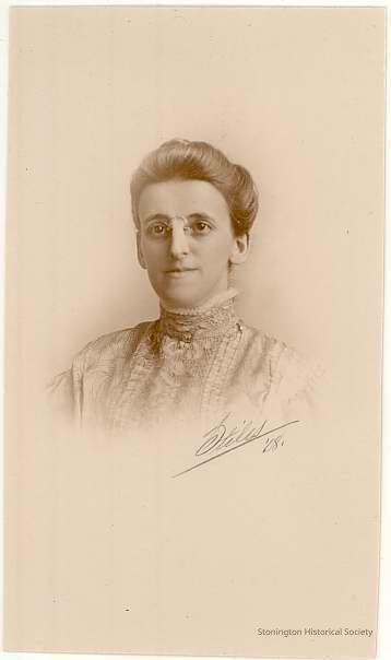 Head photo of woman in high collared lace dress, pince nez Edna Hewitt Photo by Stiles, 1908 (of Westerly?) Same woman in 1993.005.0332