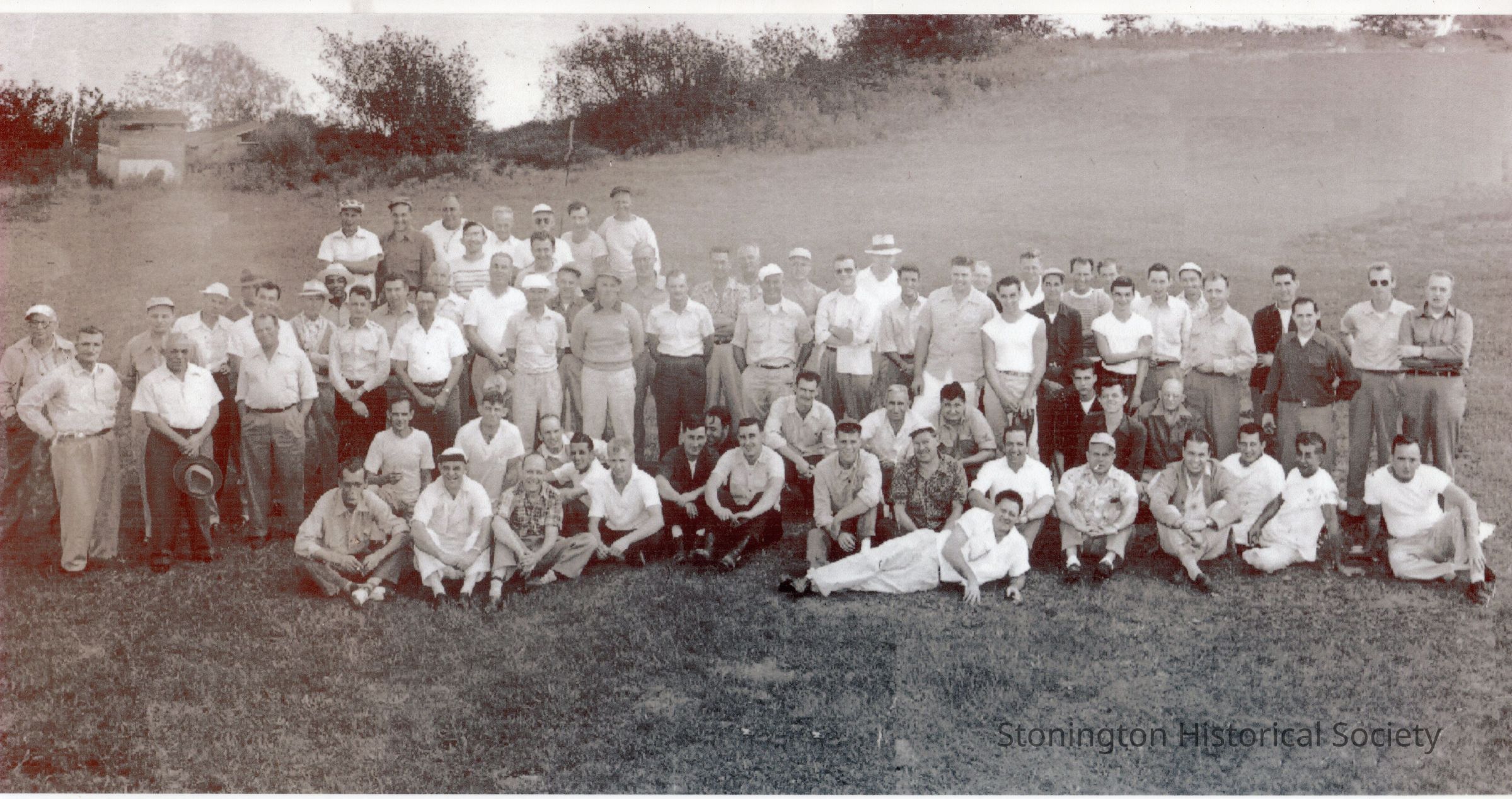 black and white photograph of Plax company picnic at Willows, 1954. Several employees identified: Joshua Santos, Owena Bessette, Dottie Christen, Natalie Morgan, Banks sisters, Carrie Santos, Evelyn Souza, Chris Dunklee, Helen Greene, Lucille Adams.