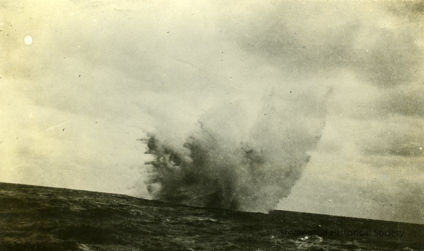 black and white photograph, depth charge at sea, stamped: "The first American mine swept up in the North Sea Barrage. The mines explode when the sweep wire touches them."Collection