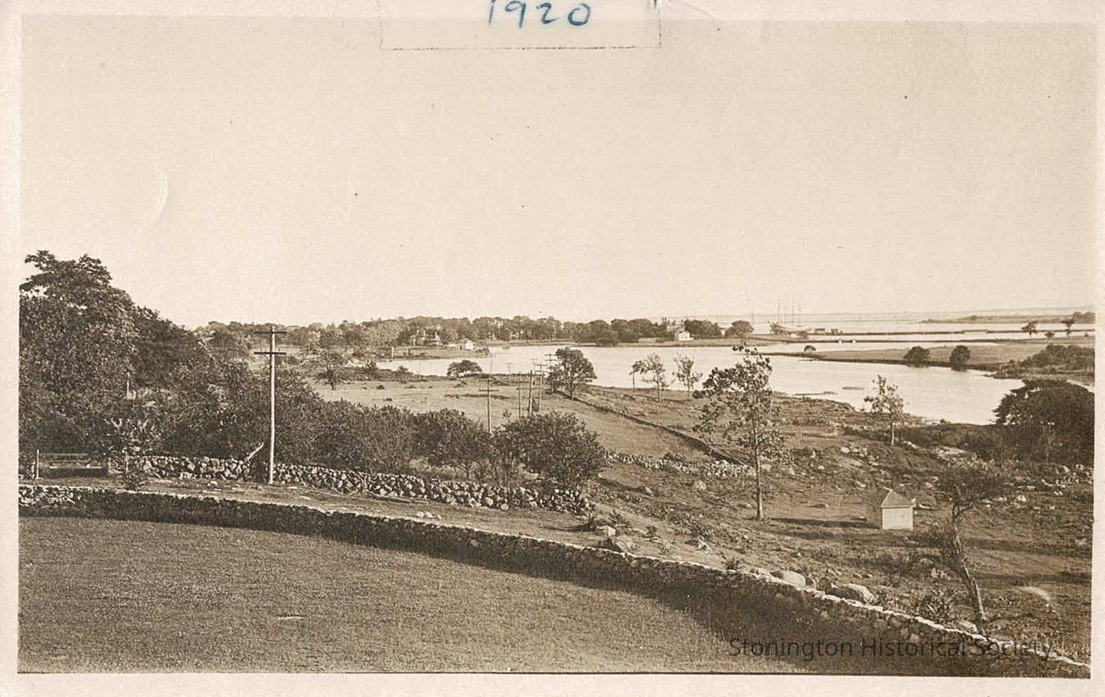 A landscape photograph of some rocky fields and pastures, presumably a part of Stone Acres farm, on the west side of North Main Street. The Captain Palmer House is barely visible in the left background across the cove.Collection