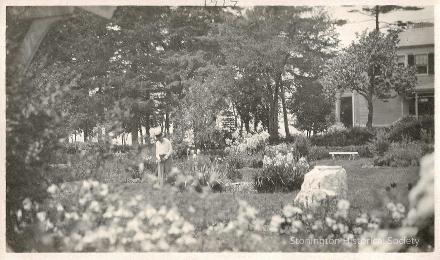Photograph taken in 1919 in the formal gardens at Stone Acres. A woman, most likely Eliza Kendall Adams, is standing in a large skirt and sun hat next to the little pond. Part of the main house is visible behind her to the right. It appears this photograph was taken by someone from inside the pergola, as part of the architectural detail is visible in the top left corner of the photograph.Collection