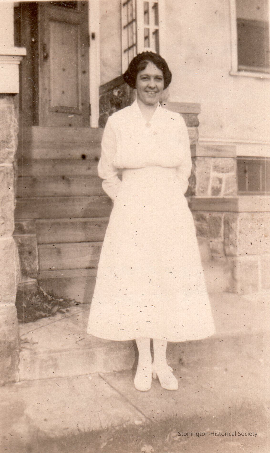 black and white snapshot, Elsie Frazier, daughter of George W. Frazier. Handwritten on back: "Elsie M. Frazier (Bowler) became first (female) supervisor, South County Hospital, Wakefield, R.I. during WWII. Ran a tightly disciplined ship. Elsie Frazier, daughter of George Frazier. Picture site (likely) at Mass General Hospital (Boston) where she was trained and graduated."Collection