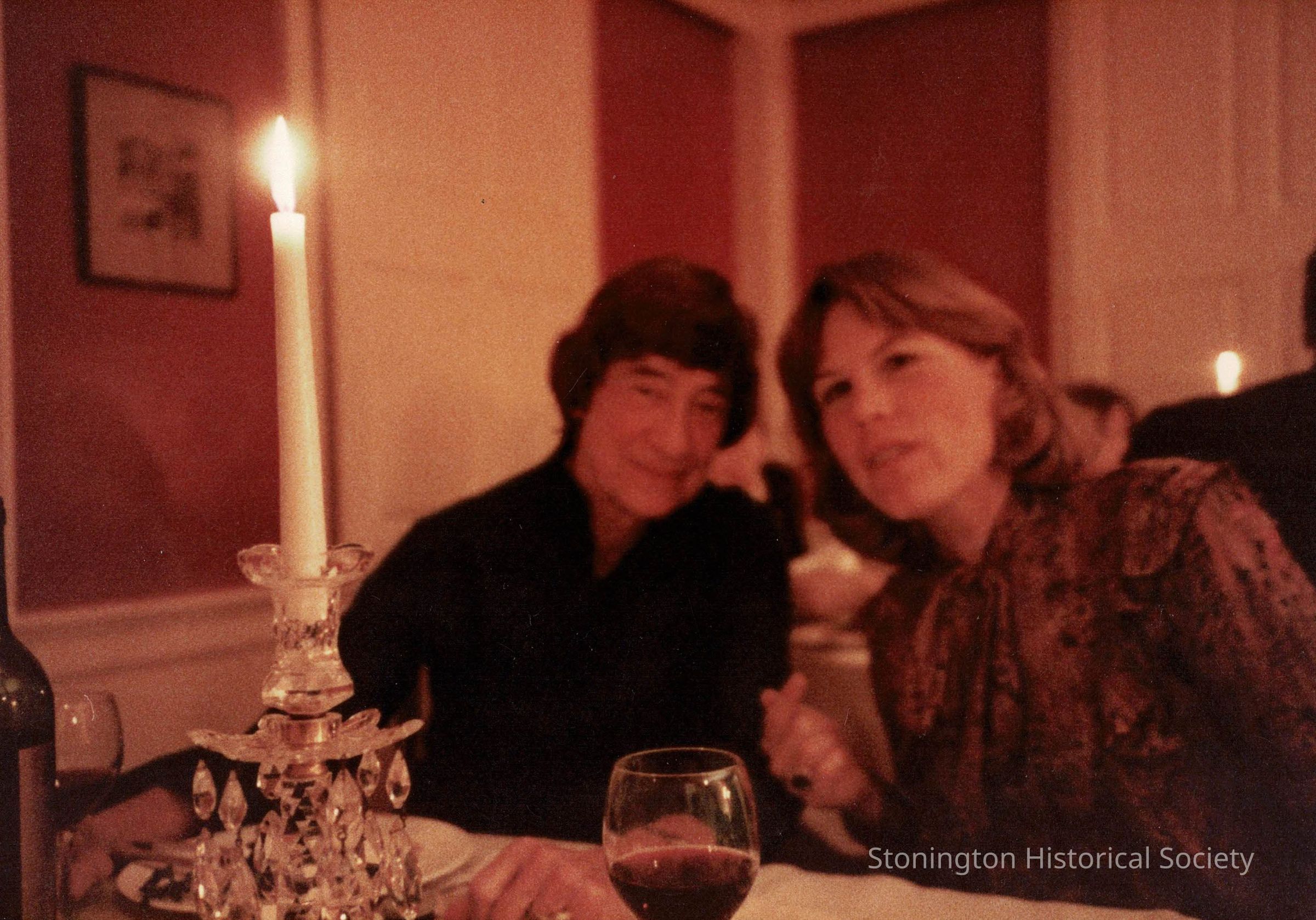 Color photograph of Rollie and an unidentified woman at a restaurant. Rollie is wearing a black dress.