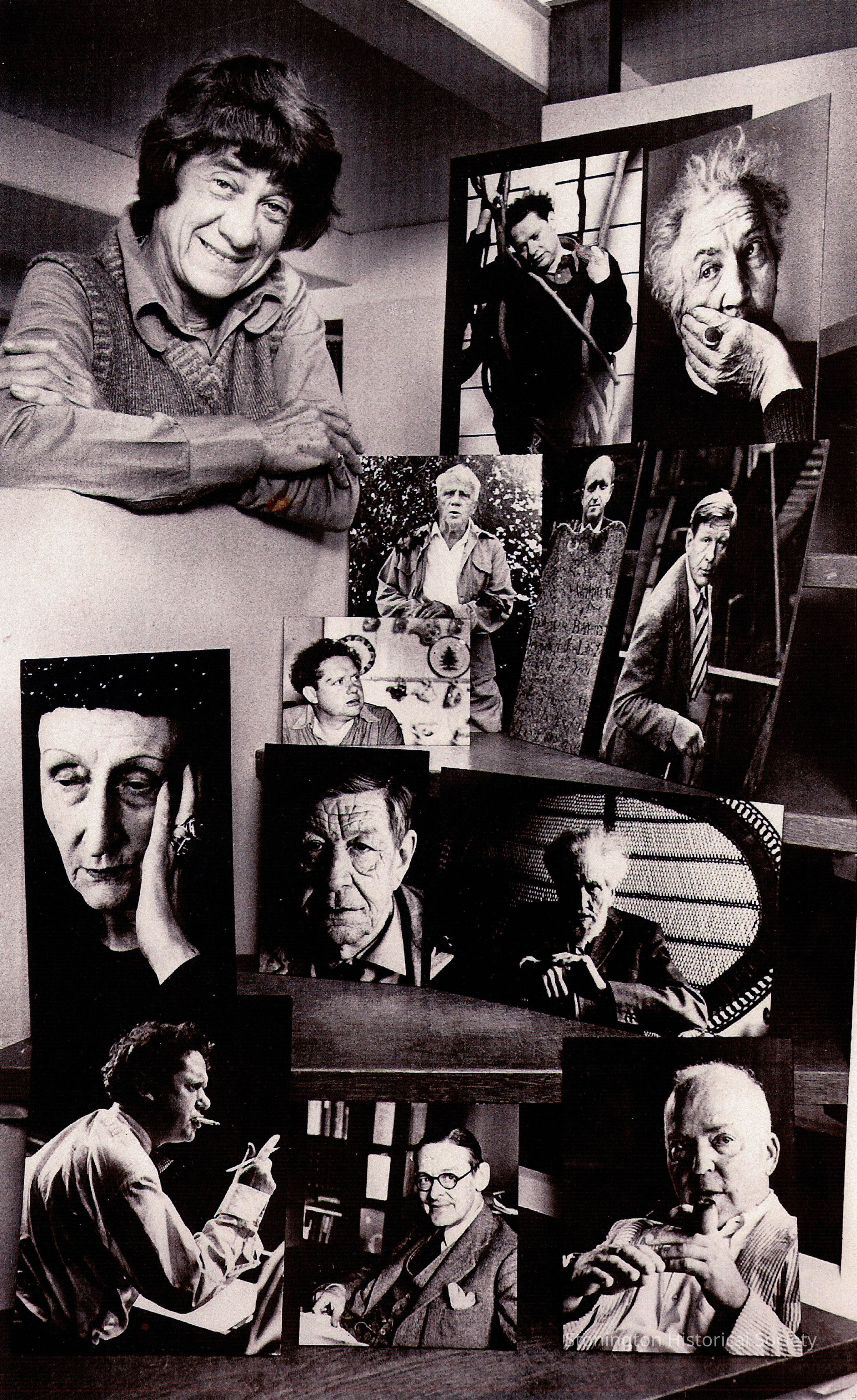 Black and white photograph of Rollie with some of her famous portraits at her home on Hancox Street. This photograph was taken for use in an article on Rollie.Collection