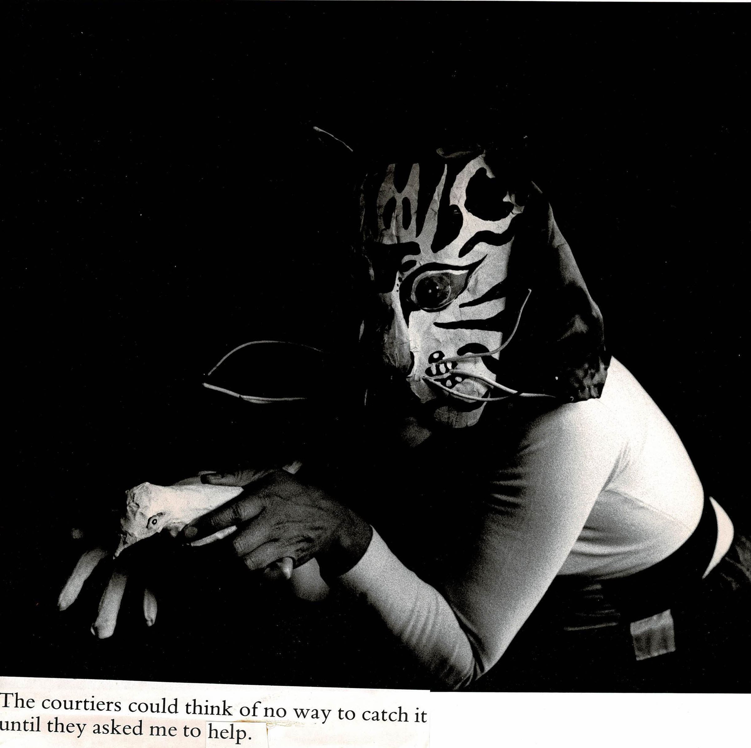 Photograph of an actor with a cat mask on. They are holding a prop bird in their hands. Text below the picture reads: "The courtiers could think of no way to catch it until they asked me to help."