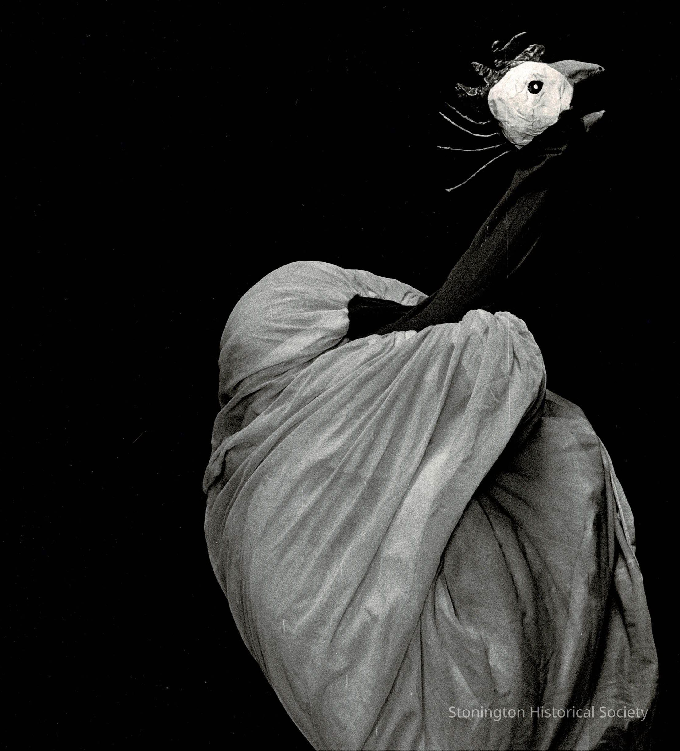 Photograph of a bird breaking out of its egg. The actor's hand serves as the bird's head and they are wrapped in what appears to be a white fitted sheet.