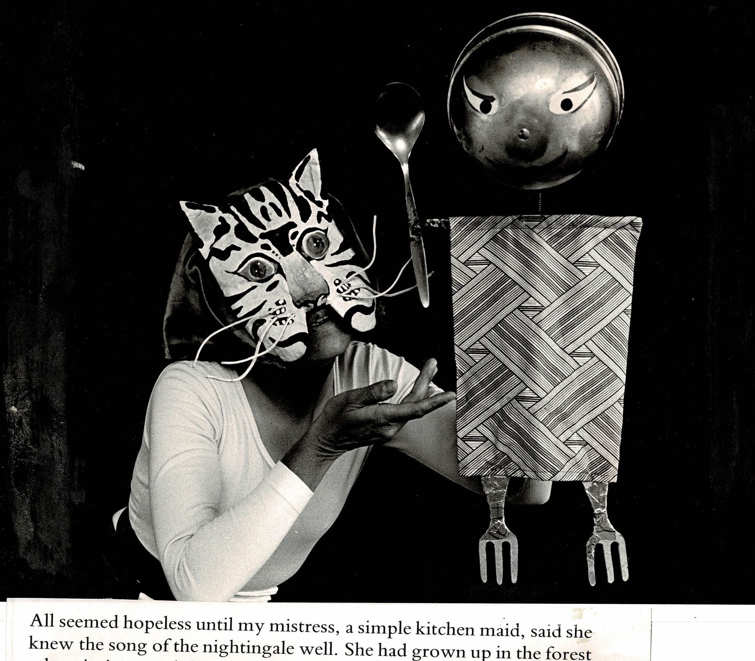 Woman wearing a cat mask with a figure made out of kitchen items. Text below the image reads: "All seemed hopeless until my mistress, a simple kitchen maid, said she knew the song of the nightingale well. She had grown up in the forest where it sings, and she agreed to take them there if I would come along to help."