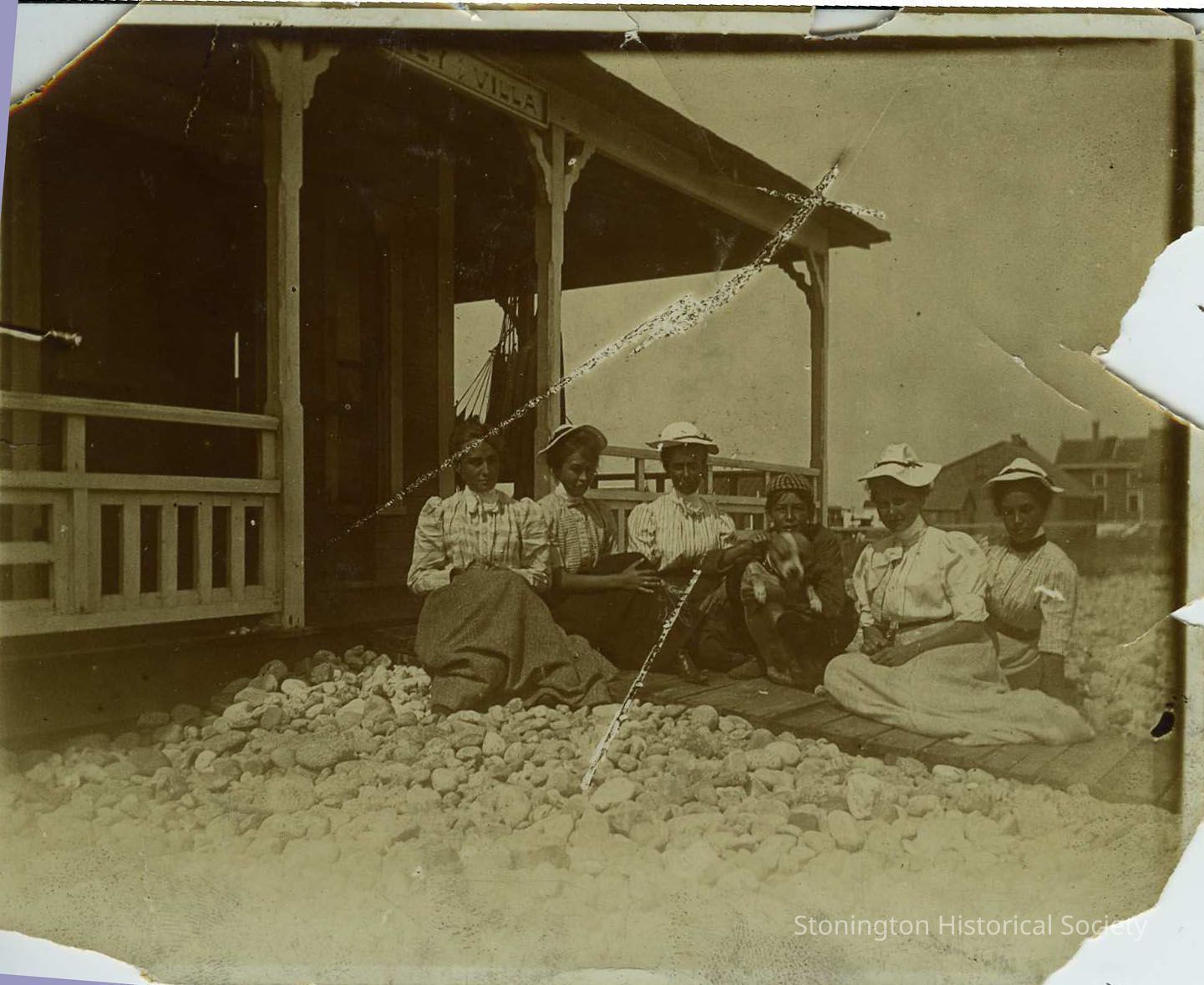 Group of women and a little boy sitting outside a beach house. The little boy is holding a dog and the sign above their head says "Villa". This is probably an Anderson beach house on Wamphassuc Point. The photograph is unidentified but one of the women on the left may be Jessie Palmer Ashby.Collection