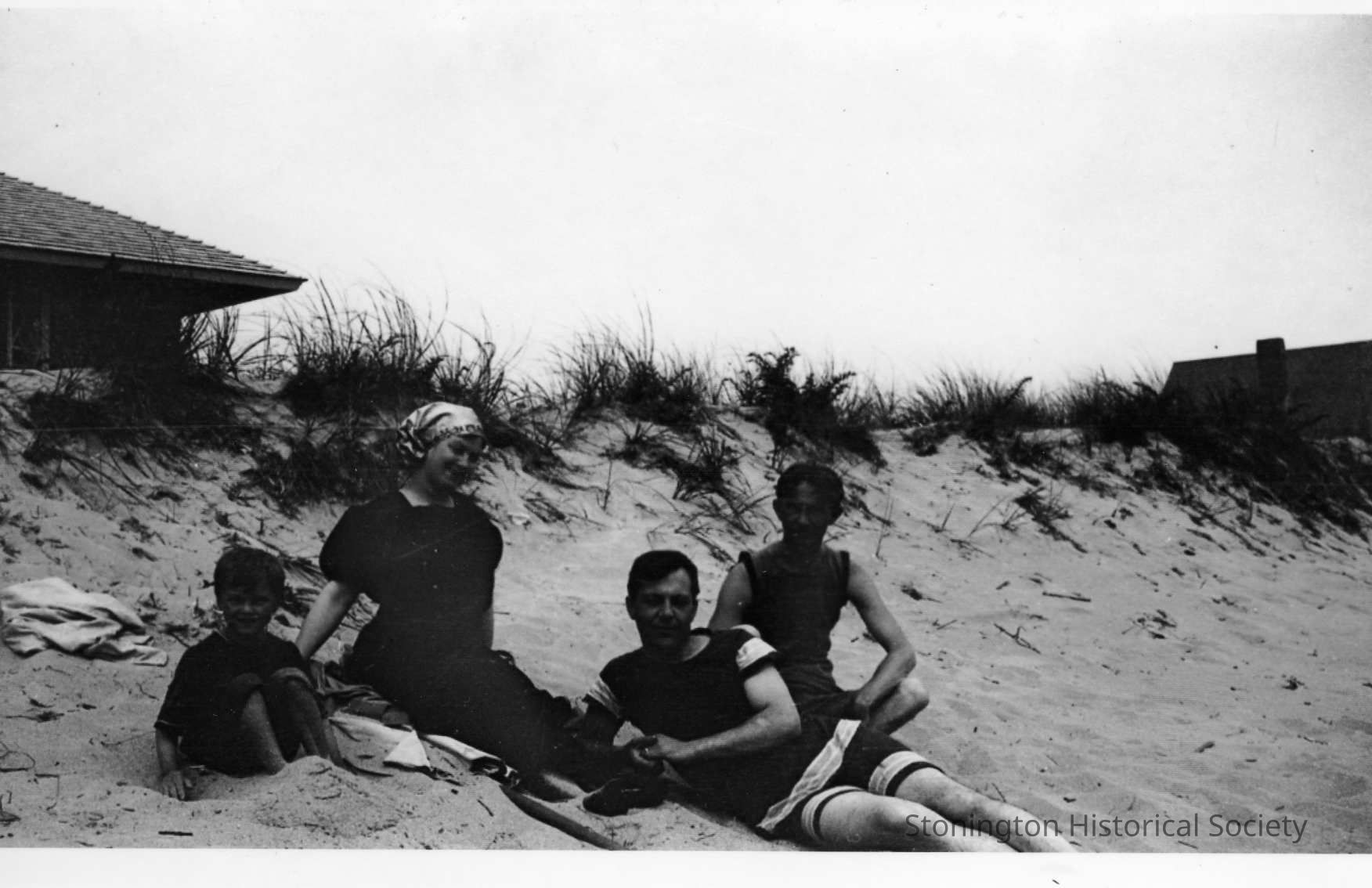 Group photograph on beach outside beach house. Robert P. Anderson is the child sitting on the left. His father, Arthur Pickett Anderson is sitting on the right. The couple in the middle is unidentified but may be Anderson relatives.