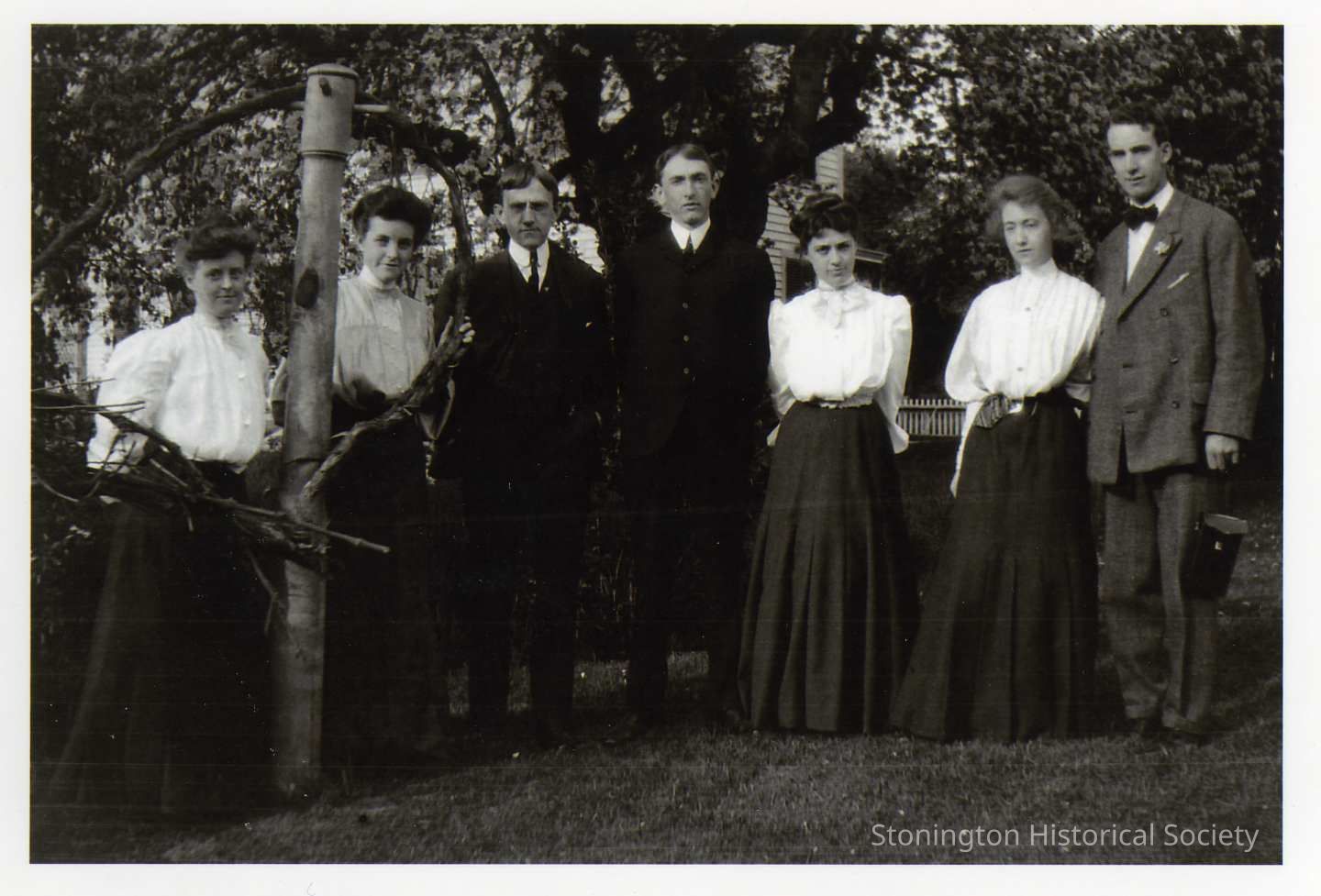 Group photograph of Anderson siblings taken at Jessie and Arthur's home in Noank. From left to right: Nell, unidentified woman (Marion?), Jerome, Carl, Jessie, Emma and unknown man. There are two copies of this photograph.