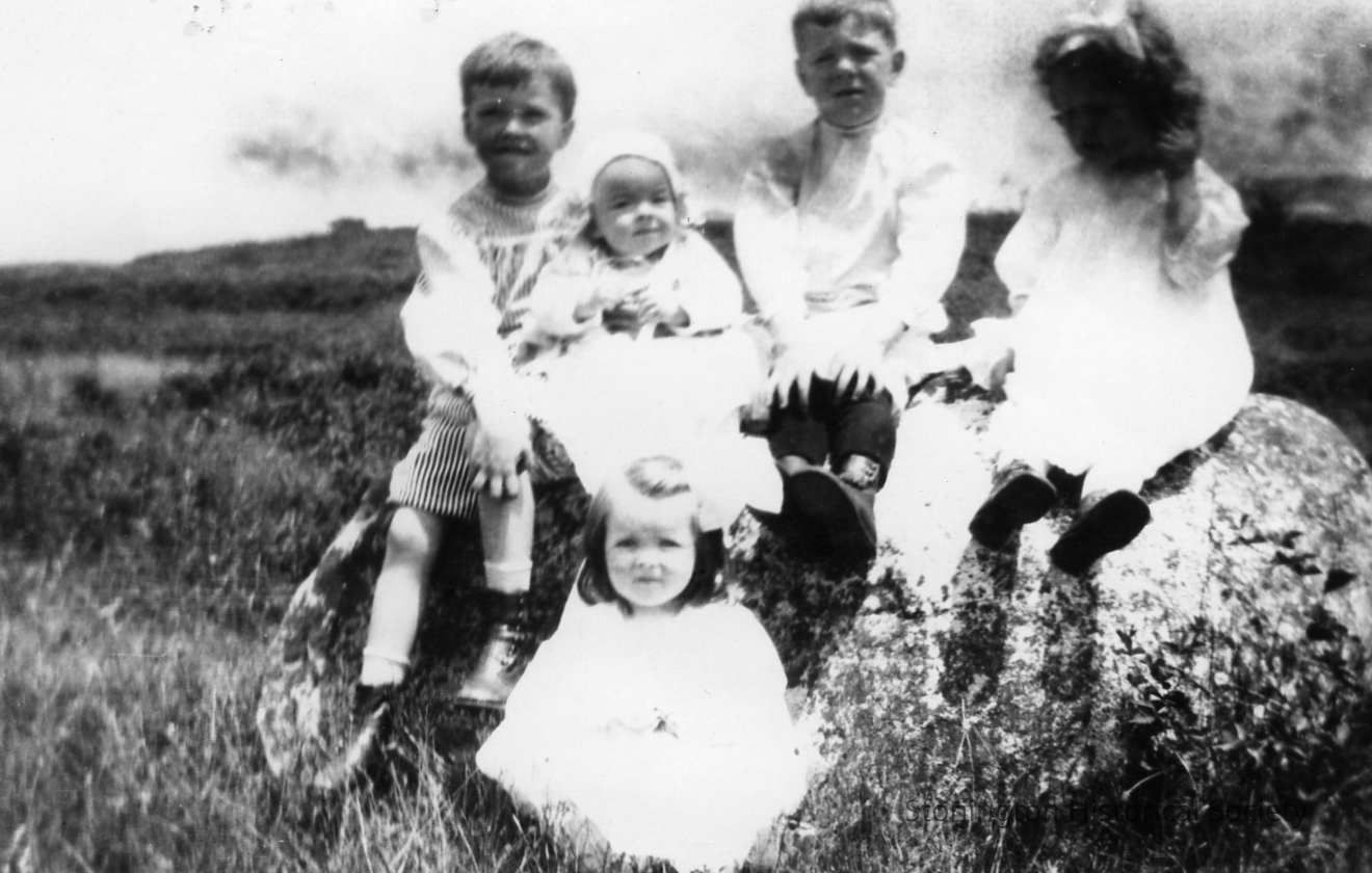 Group of children sitting on a rock, probably taken at Wamphassuc Point. Children are identified on the back: seated in front is Margaret Anderson; on the rock from left to right: Robert P. Anderson, Douglas Anderson, Jerome Anderson III and Carolyn Lack.Collection