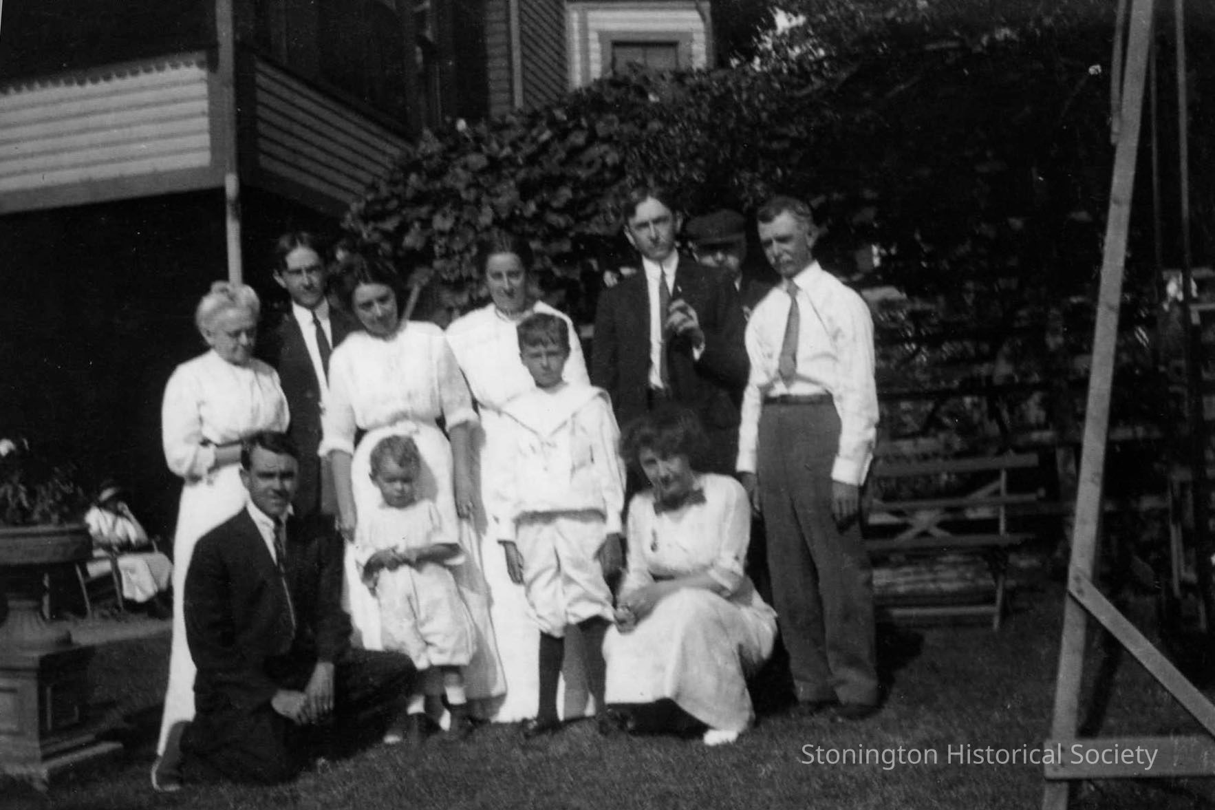 Anderson family photograph at Jerome and Emma Horn Anderson's home on Water Street. Could be for their anniversary. From left to right, back row: Emma Horn Anderson, Arthur, Jessie, Libby, Eugene, Jerome (father), Emma Horn's brother. Left to right, front row: Charles, Doug, Robert, Emma Varina. There are two copies of this photograph.