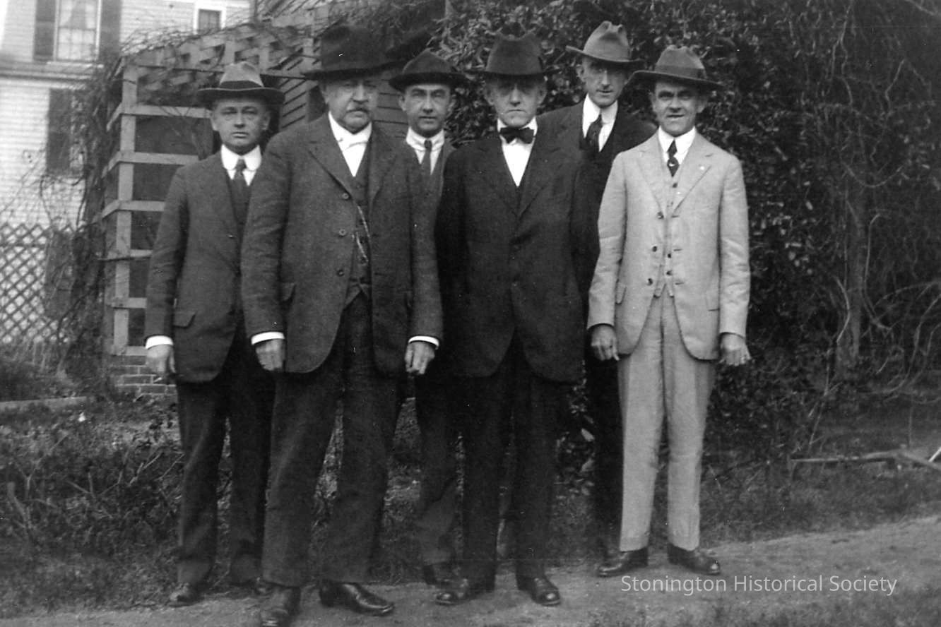 Jerome S. Anderson and his sons outside the family home at Water Street, Thanksgiving 1918. From left to right: Harry, Jerome S., Arthur, Jerome, Eugene, Charles.