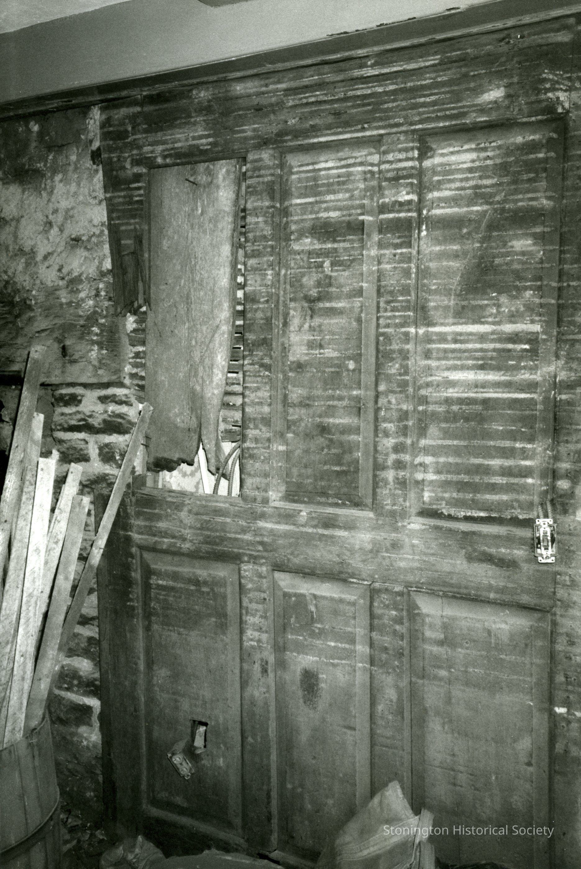 black and white photograph, Nehemiah Palmer House, Greenhaven Road, front room, wainscoting, left side of the house, c. 1990 #5A