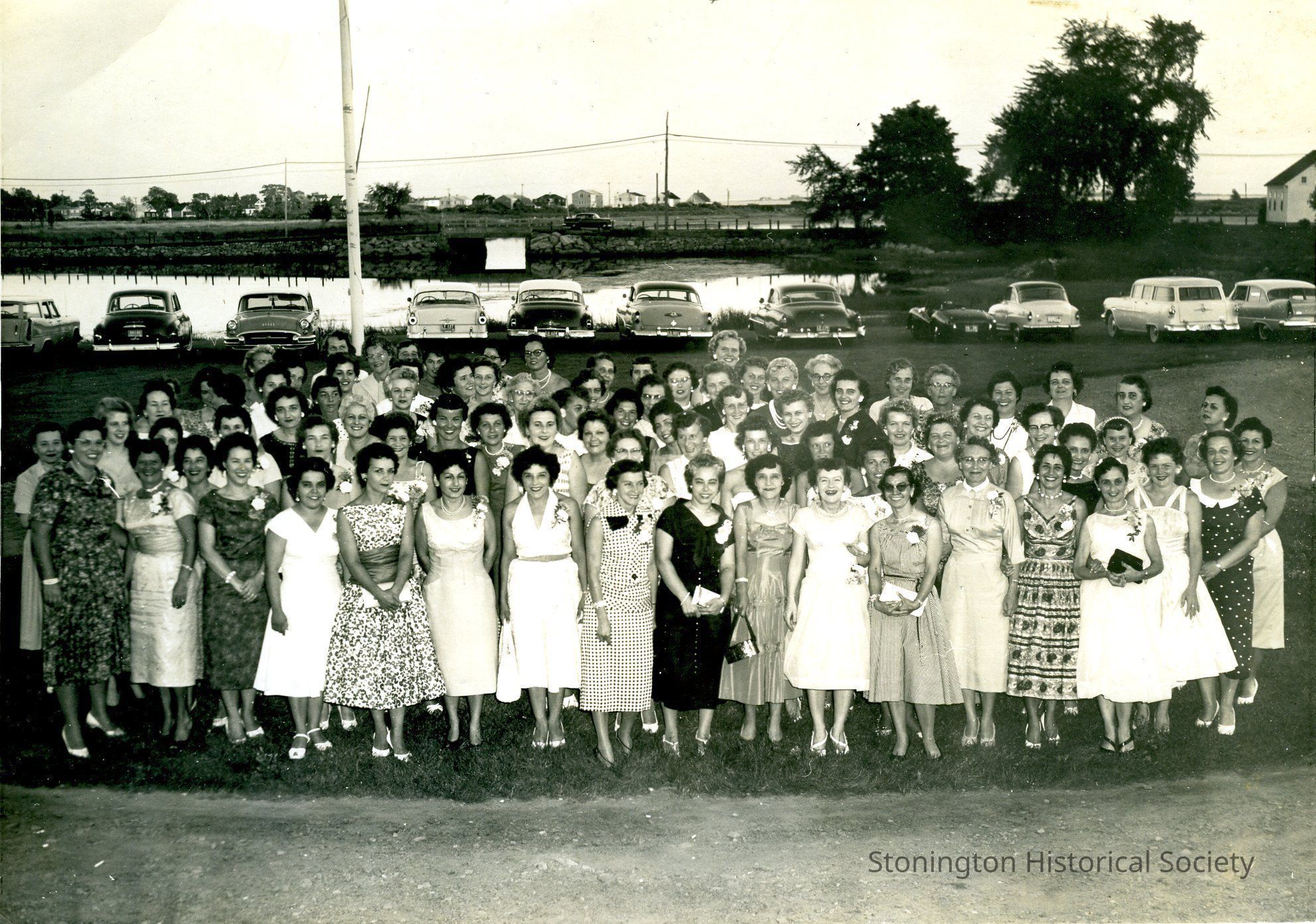 black and white photograph (2 copies) of Plax female employees at company picnic, August 1958.