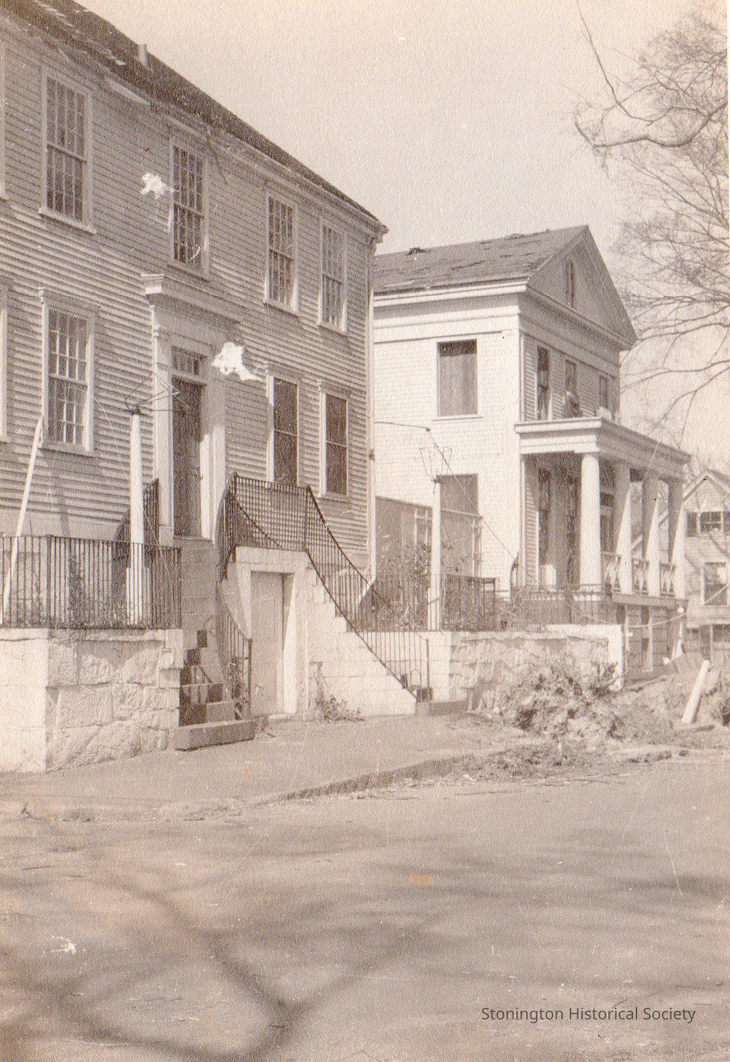 Black and white photograph, 1938 Hurricane damage to 25 & 26 Main Street, Stonington Borough. Photograph shows the Capt. Amos Palmer House/Whistler House and the Holy Ghost Society.Collection