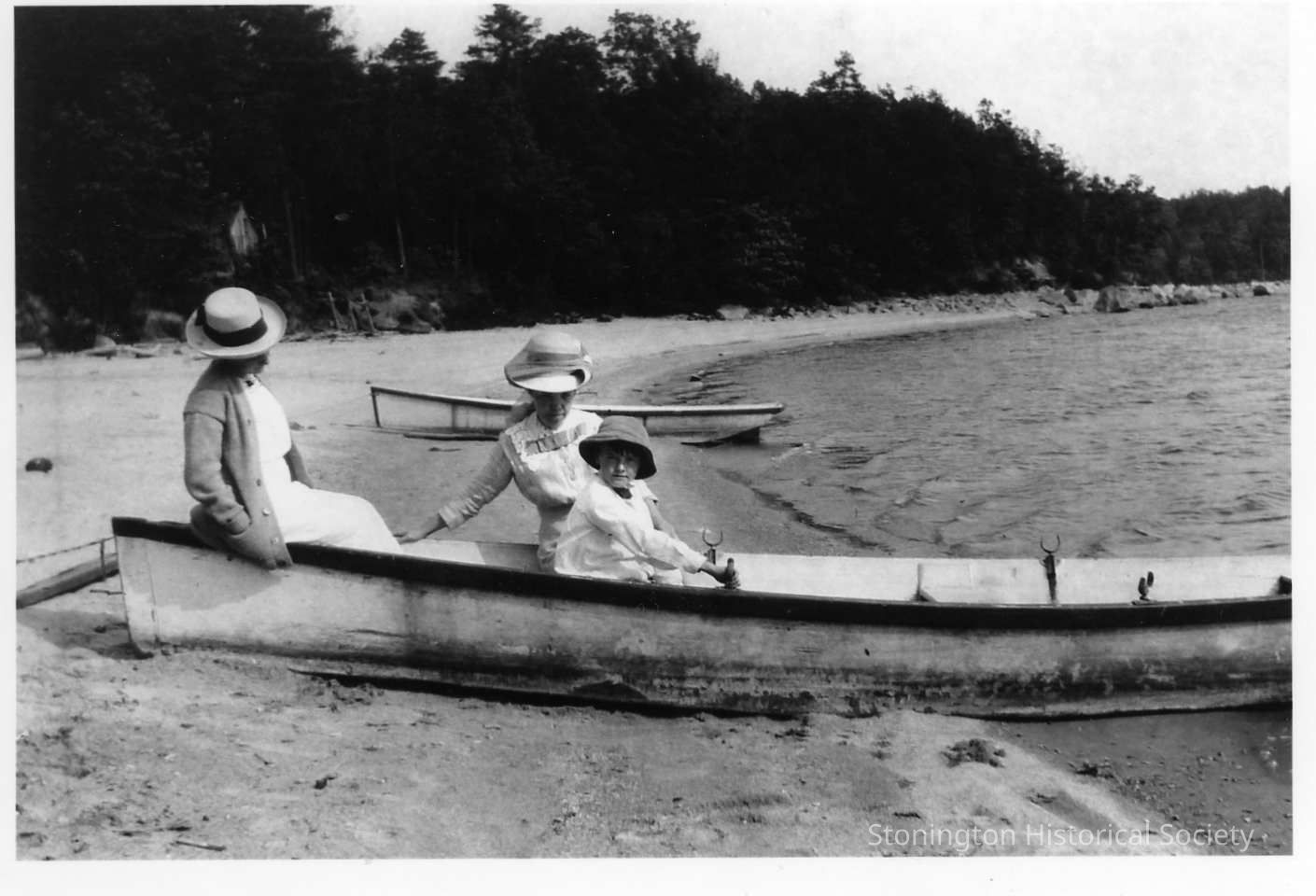 Two women seated on a beached boat with a small boy. Photograph is unidentified but could be Jessie Ashby Anderson and her son Robert P. Anderson.